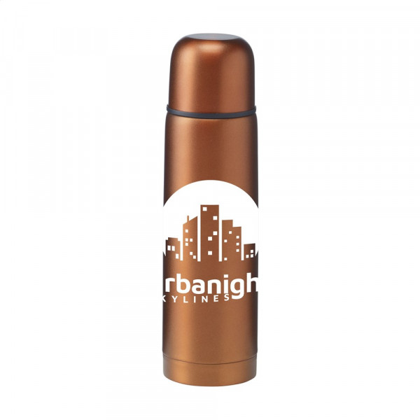 Doppelwandige, vakuumisolierte, rostfreie Edelstahl Thermoflasche mit doppeltem Schraubkopf und einem nützlichen Schanksystem. Auslaufsicher. Der Deckel ist auch als Trinkbecher zu gebrauchen. Abgerundet durch ein gefrostetes Metallfinish. Fassungsvermögen 500 ml. Wird einzeln in einem Kraftkarton geliefert.
