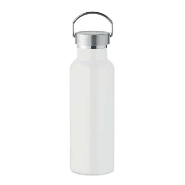 Doppelwandige Isolierflasche aus recyceltem Edelstahl (90 % recycelter Edelstahl und 10 % Edelstahl). Verschluss mit Henkel. Füllmenge: 500 ml.