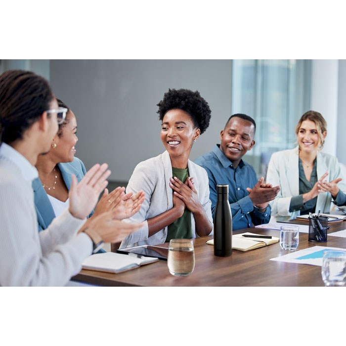 Elegantes 3teiliges Geschenk-Set: DIN A5 Notizbuch mit gebundenem Hard Cover aus RPET. 80 Blatt ( 160 Seiten) liniertes Recyclingpapier. Elastisches Verschlussband, Stiftschlaufe und Lesebändchen. Passender Drehkugelschreiber. Doppelwandige Isolierflasche aus Edelstahl. Füllmenge: 500 ml. Lieferung in Geschenkbox. FSC®-certified | FSC MIX CREDIT, P7.1, FSC-C213206