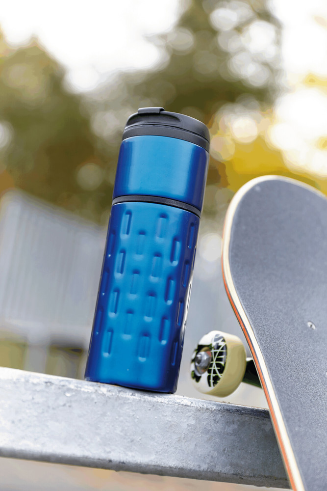 Isolierbecher EXCLUSIVE LIQUID, doppelwandig: außen aus Edelstahl in futuristischem Design und mit dekorativem Silikonring, innen aus Kunststoff, Deckel mit sicherem Schraubverschluss und integrierter Trinköffnung zum Aufklappen, gummierter Standfuß für gute Bodenhaftung, Füllmenge ca. 400 ml, in Box