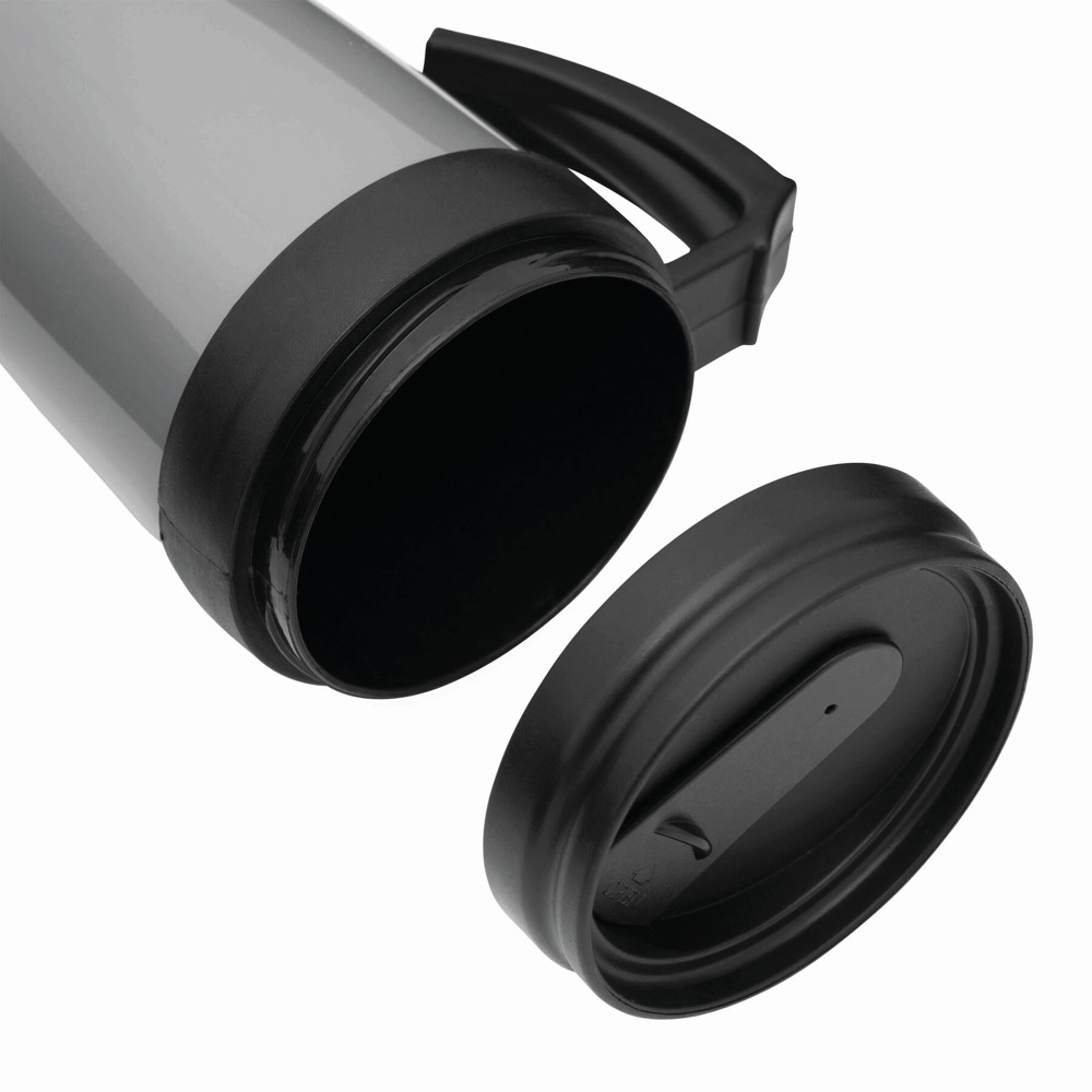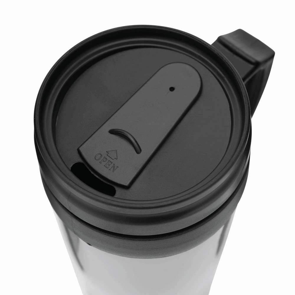 Trinkbecher WARM-UP, doppelwandig: innen und außen aus Kunststoff, mit praktischem Kunststoffgriff und Trinköffnung im Deckel, Füllmenge ca. 400 ml, in Box