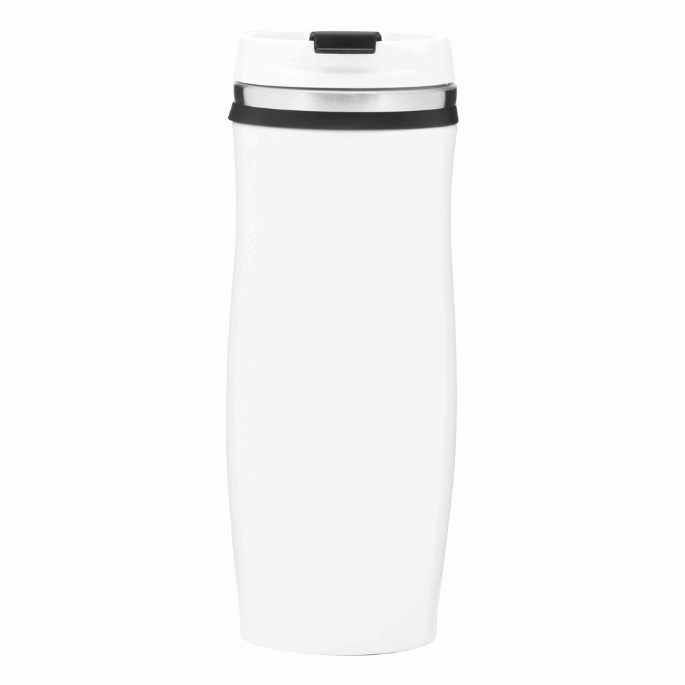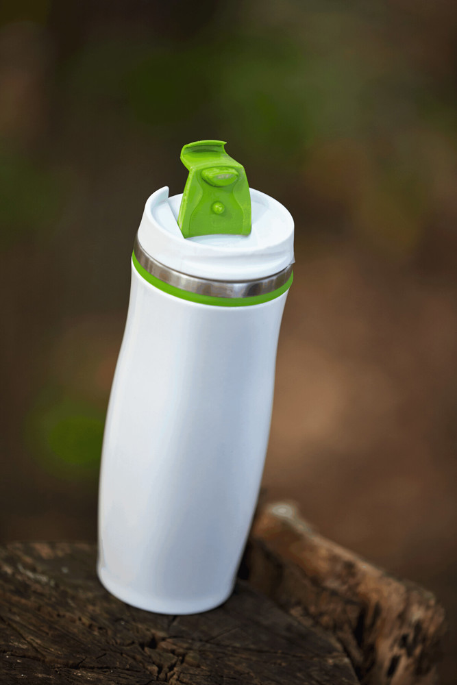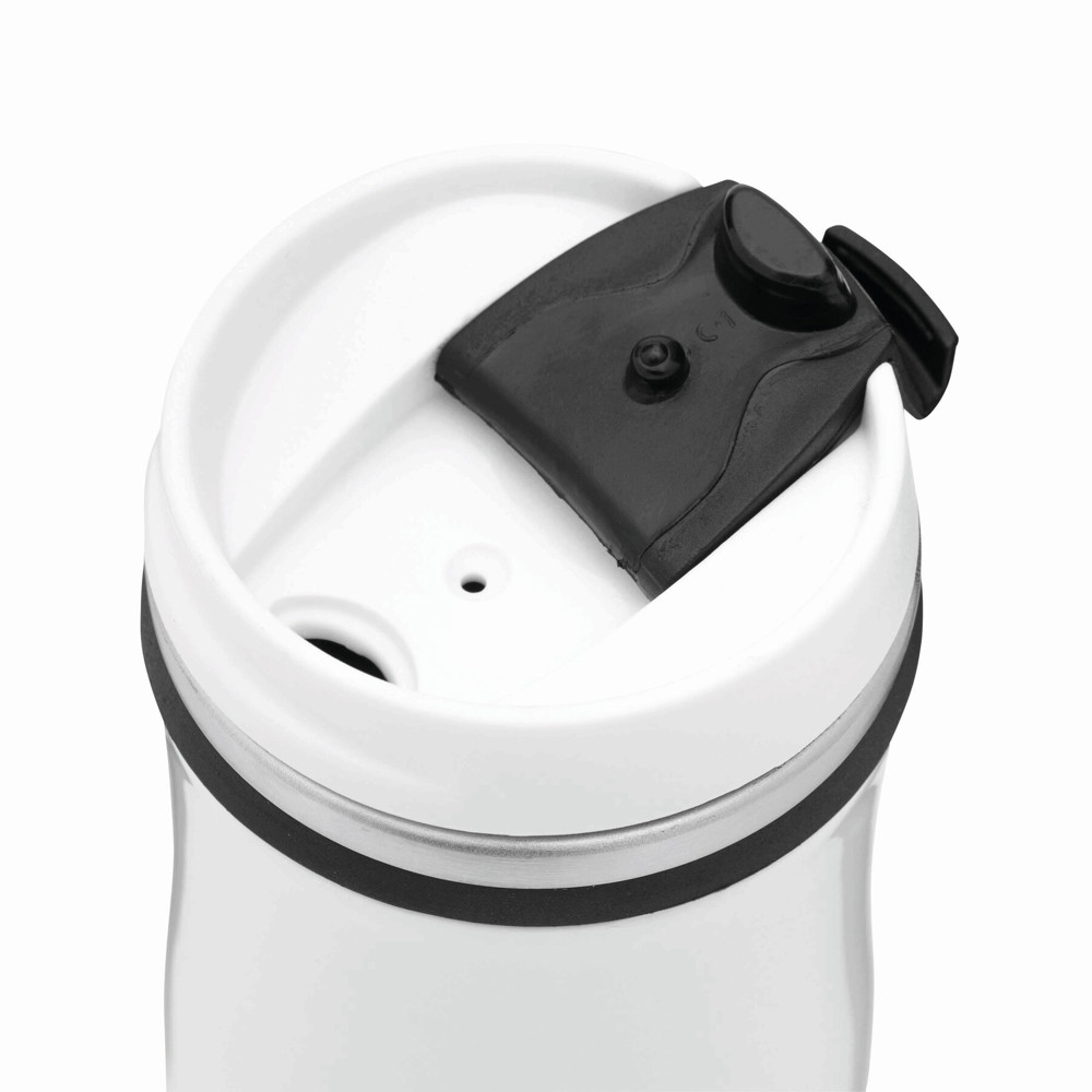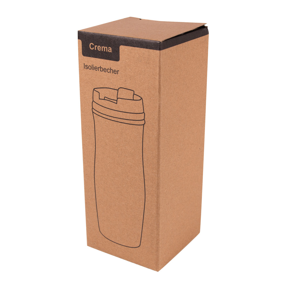 Isolierbecher CREMA, doppelwandig: innen und außen aus Edelstahl, Kunststoff-Deckel mit sicherem Schraubverschluss und integrierter Trinköffnung zum Aufklappen, farbig-gummierte Manschette oben sowie gummierter Standfuß für gute Bodenhaftung, Füllmenge ca. 400 ml, in Box