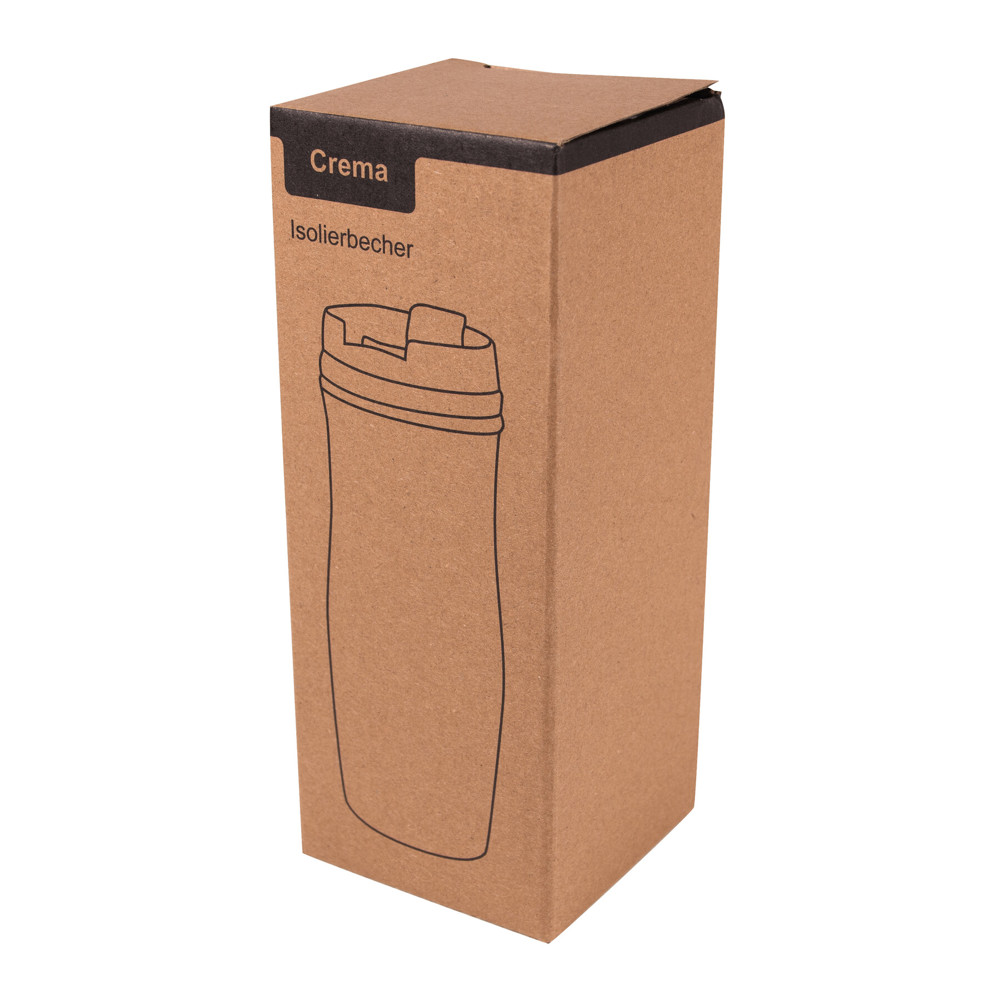 Isolierbecher CREMA, doppelwandig: innen und außen aus Edelstahl, Kunststoff-Deckel mit sicherem Schraubverschluss und integrierter Trinköffnung zum Aufklappen, farbig-gummierte Manschette oben sowie gummierter Standfuß für gute Bodenhaftung, Füllmenge ca. 400 ml, in Box