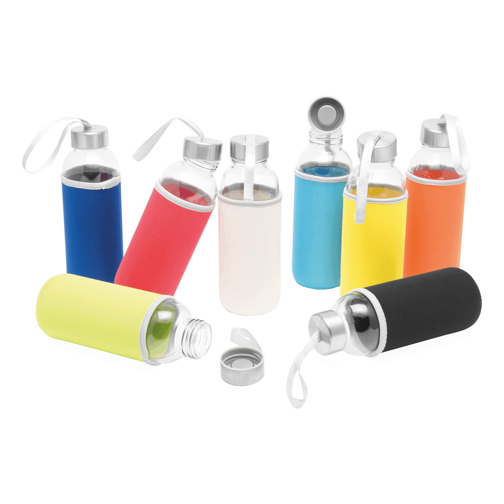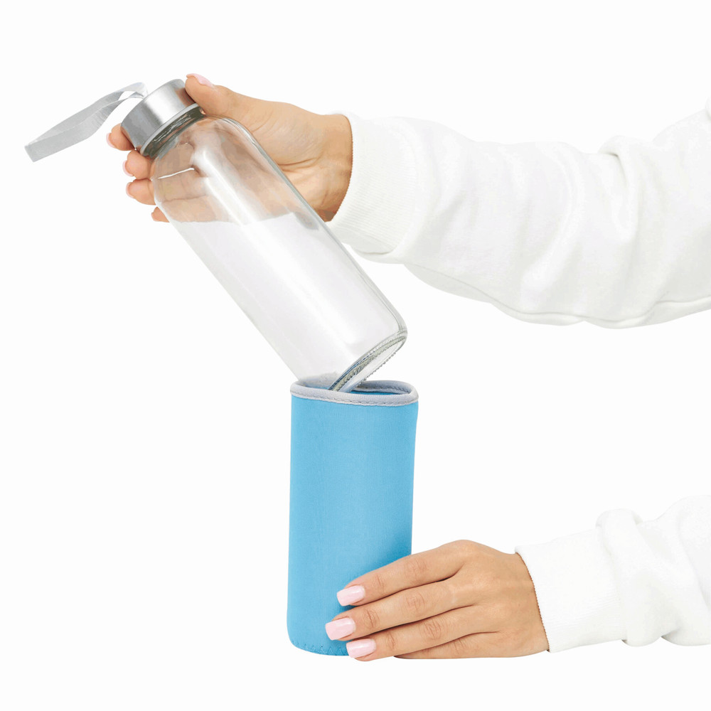 Glas-Trinkflasche TAKE WELL: Edelstahldeckel mit Schraubverschluss, Silikon-Dichtring und Handschlaufe, inkl. farbiger Schutzhülle, Füllmenge ca. 450 ml, in Box
