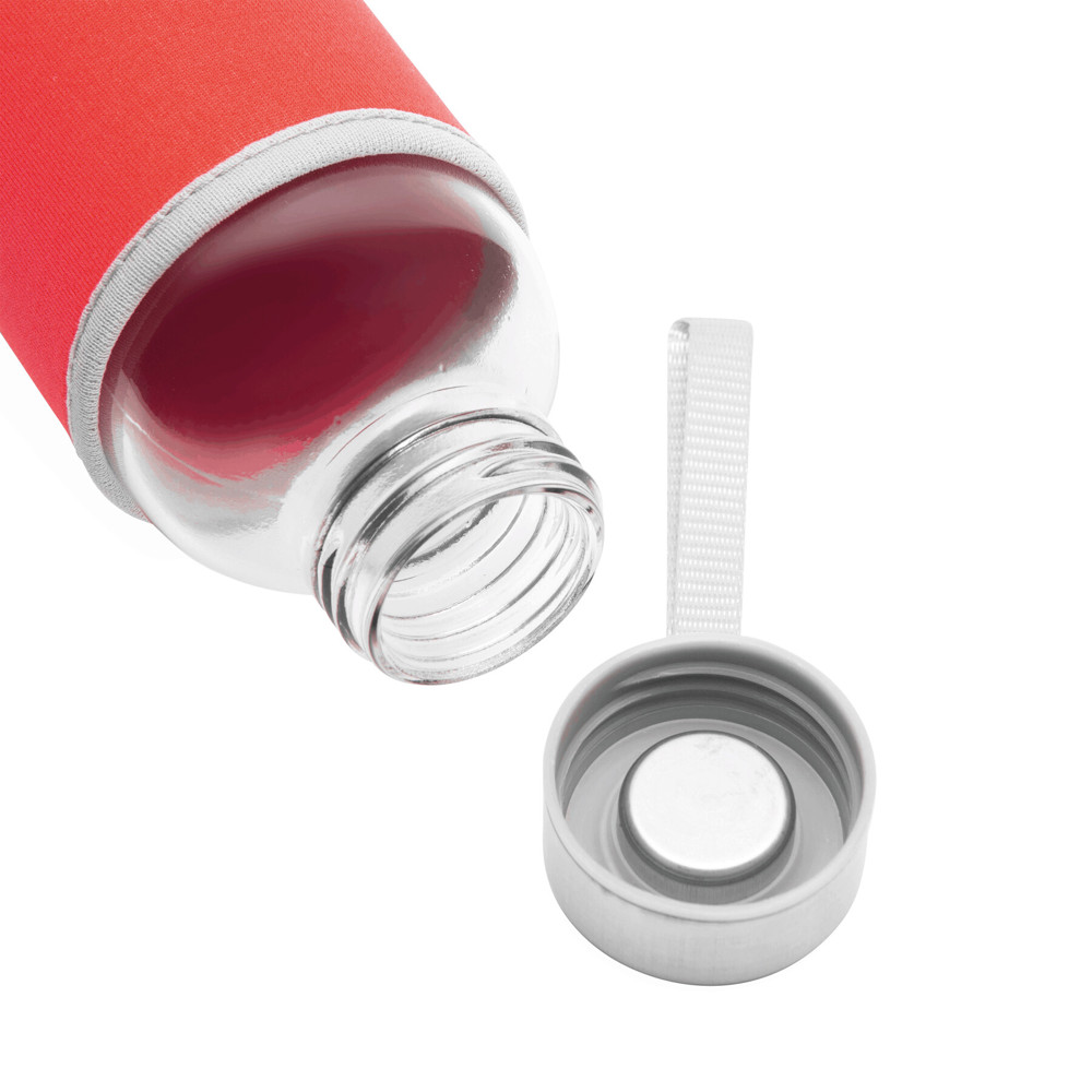Glas-Trinkflasche TAKE WELL: Edelstahldeckel mit Schraubverschluss, Silikon-Dichtring und Handschlaufe, inkl. farbiger Schutzhülle, Füllmenge ca. 450 ml, in Box