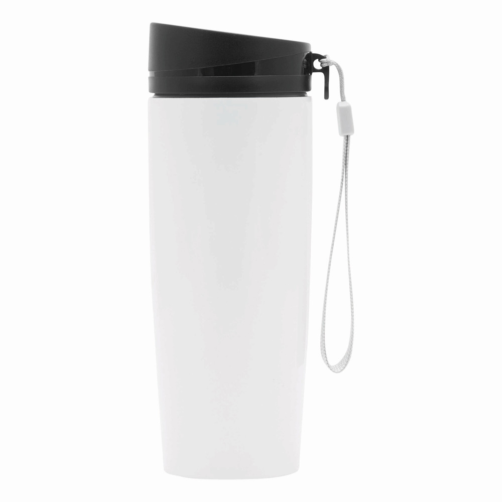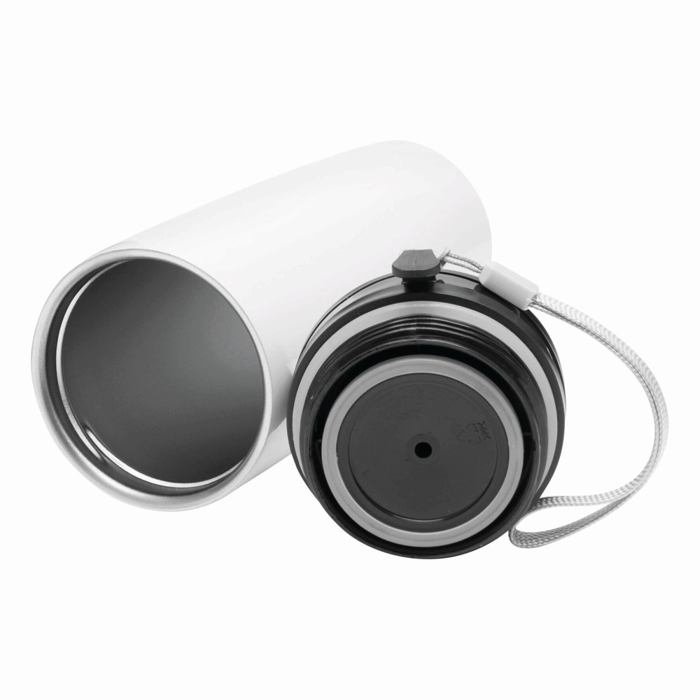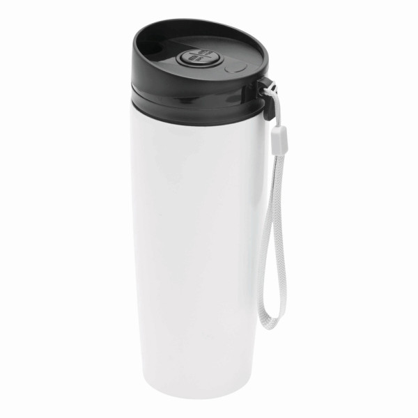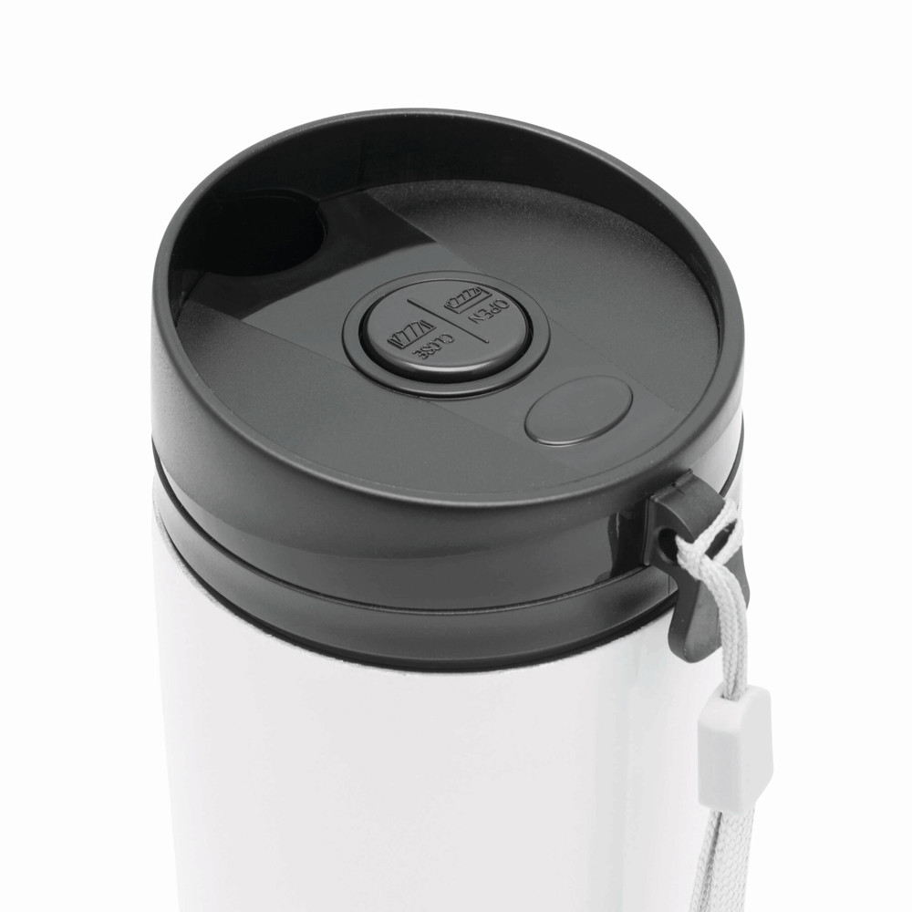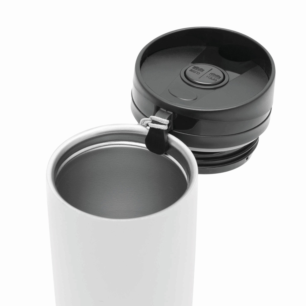 Isolierbecher EARLY MORNING, doppelwandig: innen und außen aus Edelstahl, Kunststoff-Deckel mit sicherem Schraubverschluss, Pushbutton OPEN/CLOSE und integrierter Trinköffnung, gummierter Standfuß für gute Bodenhaftung, Füllmenge ca. 380 ml, mit Handschlaufe, in Box