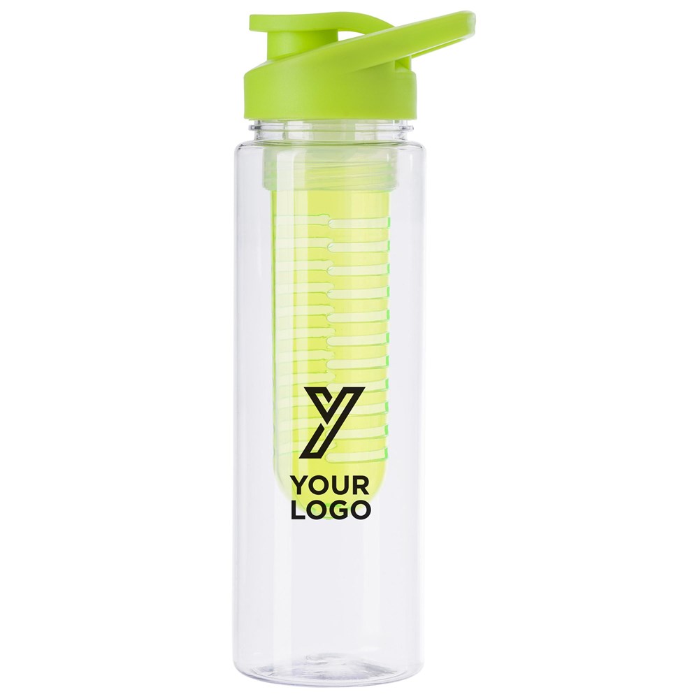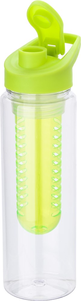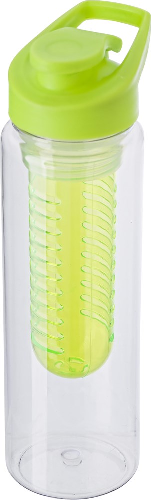 Trinkflasche aus Tritan mit einem Fassungsvermögen von ca. 700 ml und einem Einsatz für Früchte. Der Deckel ist mit einem praktischen Schraubverschluss sowie einem Henkel versehen.