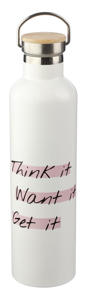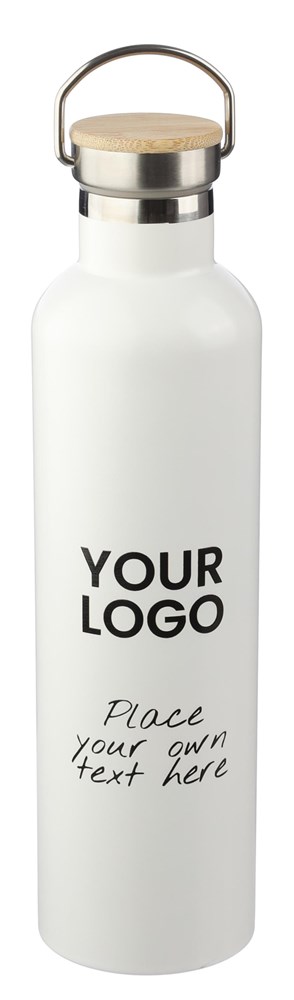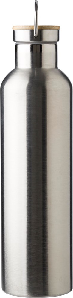 Edelstahlflasche (1 L), doppelwandig mit Tragedeckel und Bambusdetail. Heiße Getränke bleiben bis zu 12 Stunden warm, kalte Getränke bleiben bis zu 18 Stunden kalt.