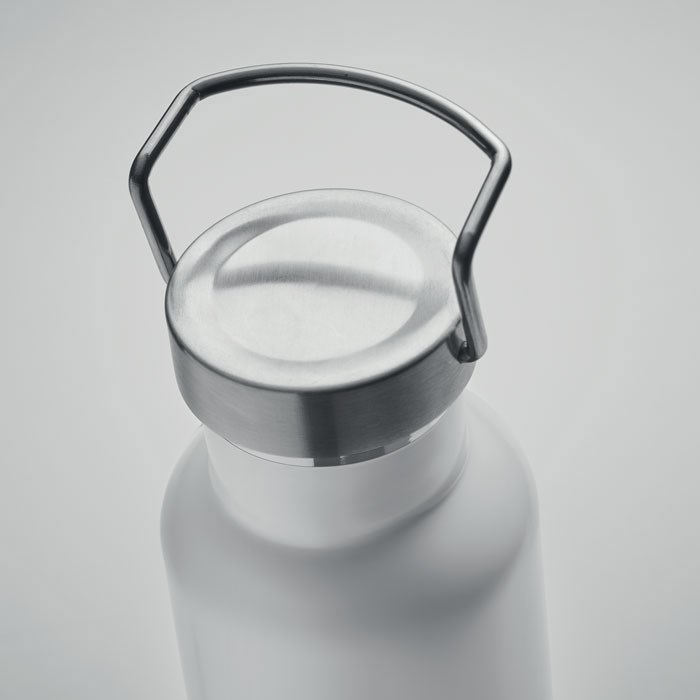 Doppelwandige Flasche aus recyceltem Edelstahl. Deckel mit Henkel und Korkboden. Auslaufsicher. Füllmenge: 500 ml. (90 % recycelter Edelstahl und 10 % Edelstahl).