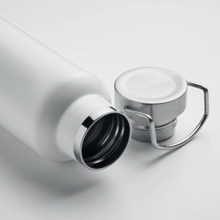 Doppelwandige Flasche aus recyceltem Edelstahl. Deckel mit Henkel und Korkboden. Auslaufsicher.... mehr