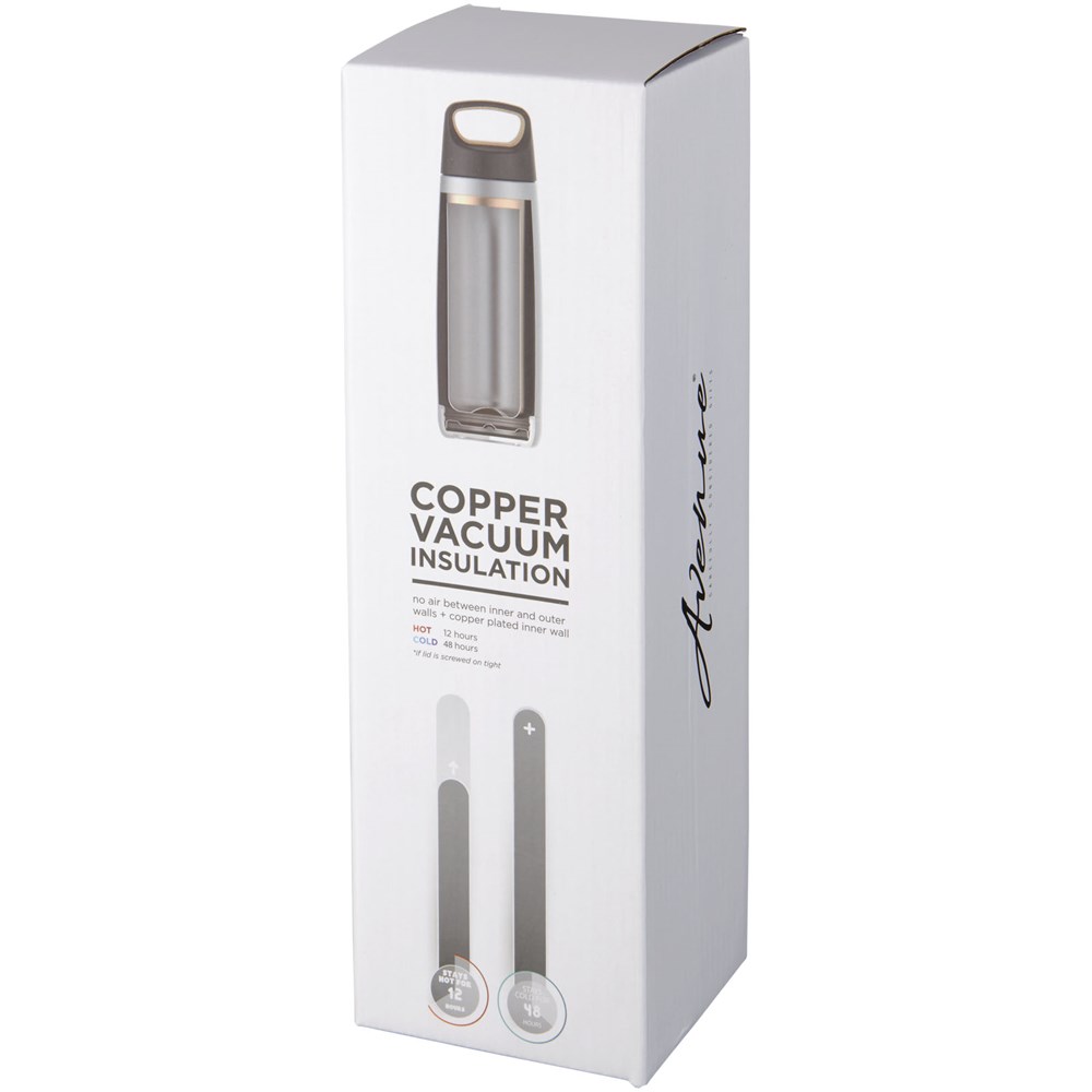 Die doppelwandige Vakuumkonstruktion aus Edelstahl mit Kupferisolierung ermöglicht es, dass Ihr Getränk 48 Stunden lang kalt und mindestens 12 Stunden lang heiß bleibt. Die Konstruktion verhindert auch eine Kondensation an der Außenseite der Flasche. Schraubdeckel mit Kork-Design-Details sowie ein rutschfester Boden. Das Fassungsvermögen beträgt 600ml. Präsentiert in einer Avenue-Geschenkschachtel.