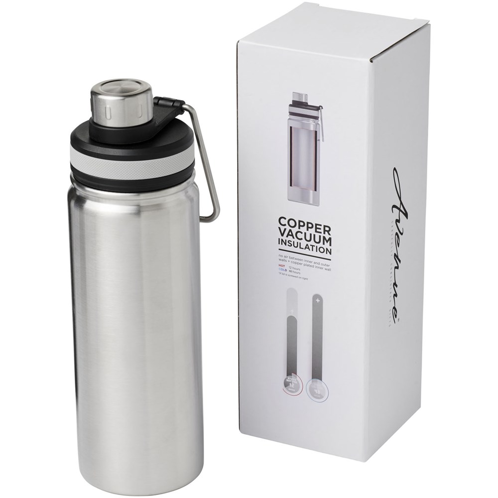 Doppelwandige Edelstahl-Vakuumkonstruktion mit Kupferisolierung, welche dafür sorgt, dass Ihr Getränk mindestens 12 Stunden lang heiß und 48 Stunden lang kalt bleibt. Die Konstruktion verhindert auch eine Kondensation an der Außenseite der Flasche. Ausgestattet mit einem Schraubverschluss und einem Edelstahldeckel mit einem praktischen Tragegriff. Konstruktion mit zwei Öffnungen für einfache Reinigung und Befüllung. Das Fassungsvermögen beträgt 590 ml. Präsentiert in einer Avenue-Geschenkschachtel.