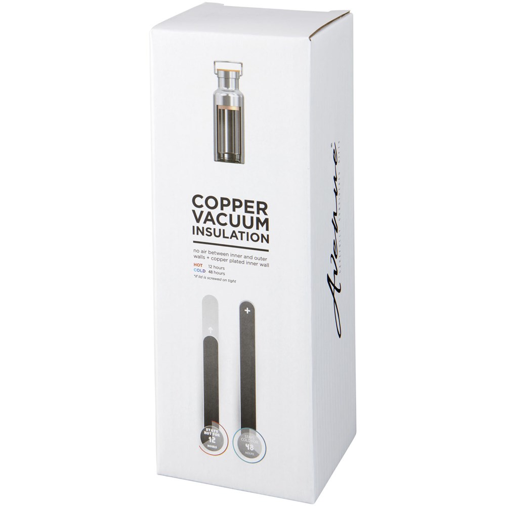 Die doppelwandige Vakuumkonstruktion aus Edelstahl mit Kupferisolierung ermöglicht es, dass Ihr Getränk 48 Stunden lang kalt bzw. mindestens 12 Stunden lang heiß bleibt. Die Konstruktion verhindert auch eine Kondensation an der Außenseite der Flasche. Schraubdeckel mit Holzdetail. Trendige, strapazierfähige Pulverbeschichtung. Das Fassungsvermögen beträgt 480ml. Präsentiert in einer Avenue-Geschenkschachtel.