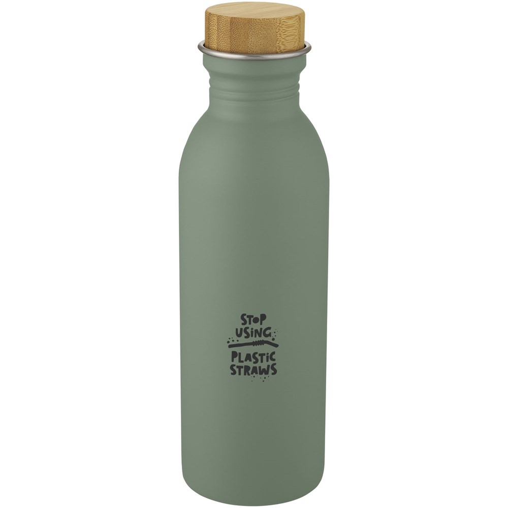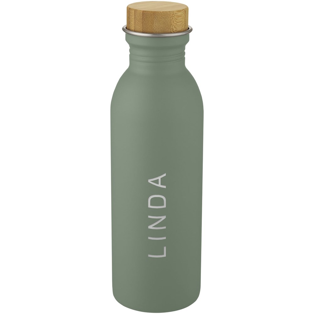 Einwandige Sportflasche aus 18/8-Edelstahl mit einem Deckel aus Bambus. BPA-frei, geprüft und zugelassen nach dem deutschen Lebensmittelrecht (LFGB). Auf Phthalate geprüft und zugelassen gemäß den REACH-Vorschriften. Der verwendete Bambus stammt aus nachhaltigen, umweltfreundlichen und sozialverträglichen Quellen. Das Fassungsvermögen beträgt 650 ml. Handwäsche empfohlen. Verpackt in einer Geschenkbox aus Recyclingkarton.