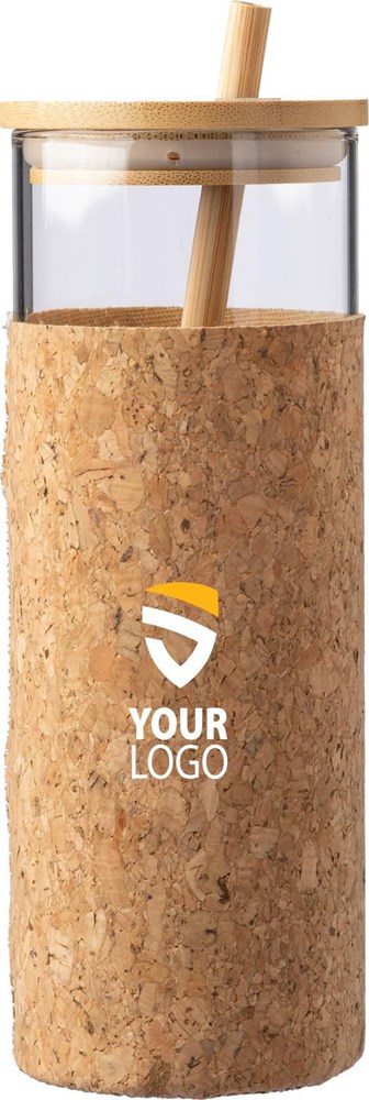 Einwandiger Trinkbecher (450 ml) aus Glas (Borosilikat) mit Korkhülle, Bambusdeckel und Strohhalm. Geeignet für heiße und kalte Getränke. Einzeln verpackt in einem braunen Karton.
