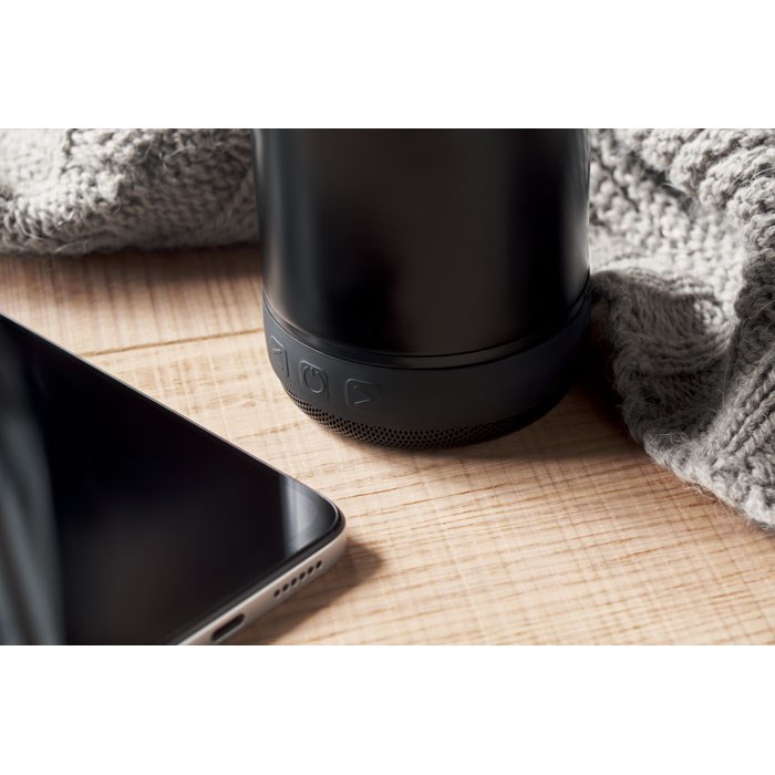 Doppelwandige Isolierflasche aus recyceltem Edelstahl (90 % recycelter Edelstahl und 10 % Edelstahl) und Silikonschlaufe. Füllmenge: 500 ml. Abnehmbarer kabelloser 3W-Lautsprecher. Inkl. 500 mAh Akku. Der Lautsprecher kann zur Reinigung abgenommen werden.