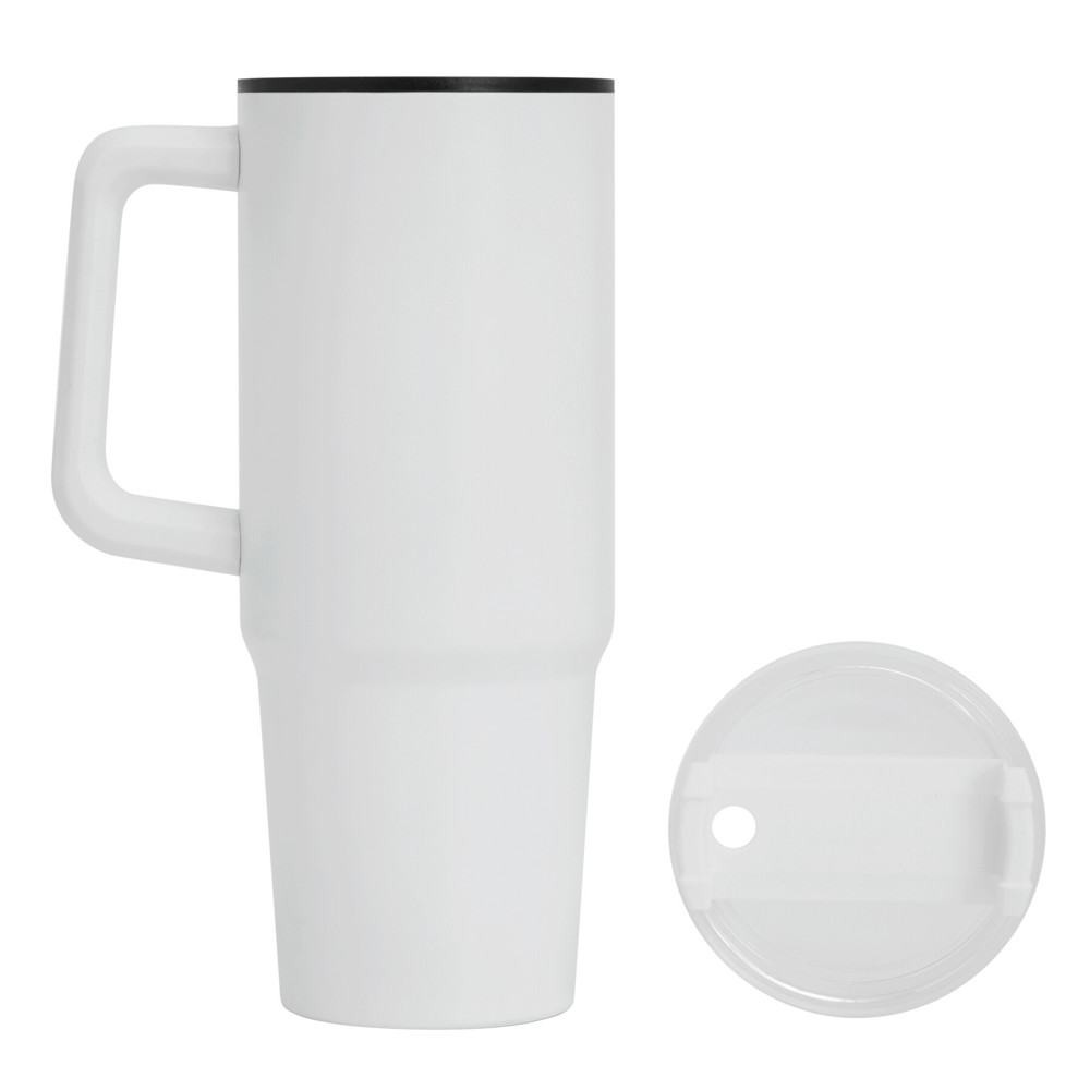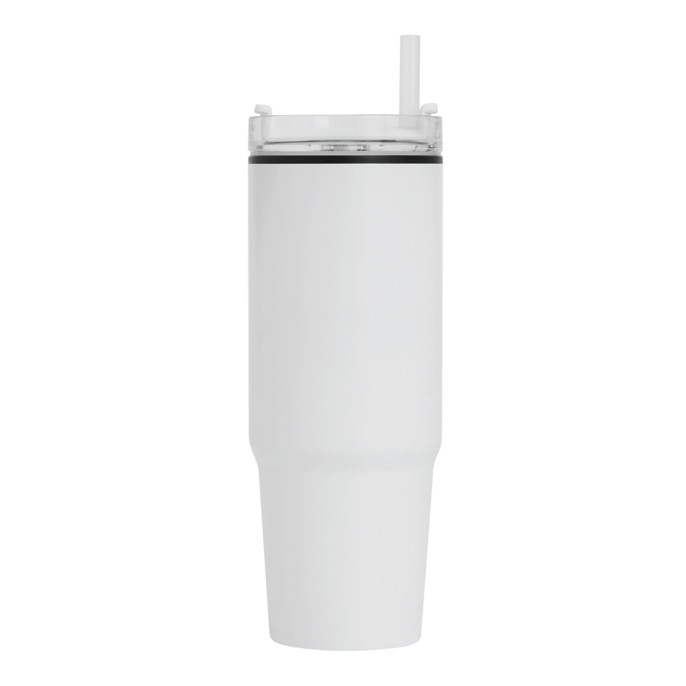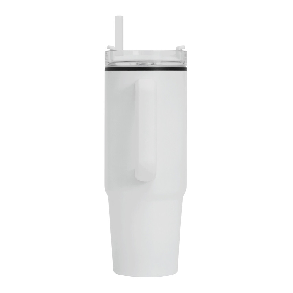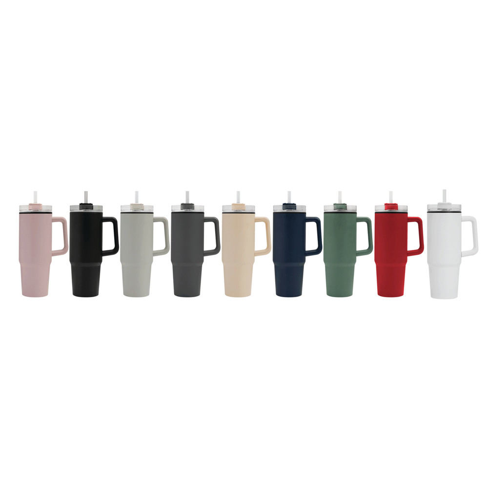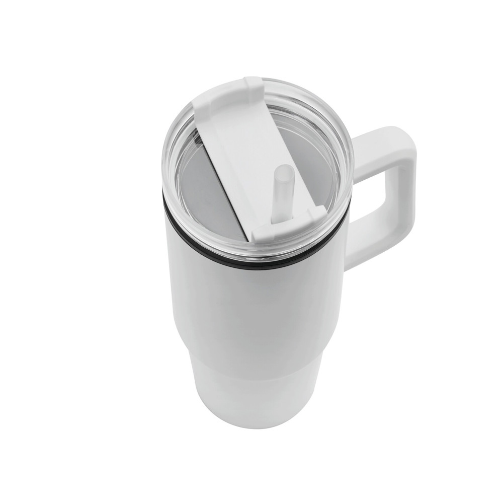 Trinkbecher DRINK ULTY, doppelwandig: innen aus Kunststoff und außen aus Edelstahl, mit praktischem Griff, transparenter Kunststoff-Deckel mit sicherem Schraubverschluss, Silikon-Dichtring, Trinköffnung mit Drehverschluss und transparentem Strohhalm, beschichteter Boden für gute Oberflächenhaftung, Füllmenge ca. 900 ml, hält ca. 2 Stunden warm und bis zu 4 Stunden kalt, in Box