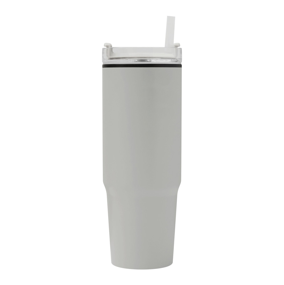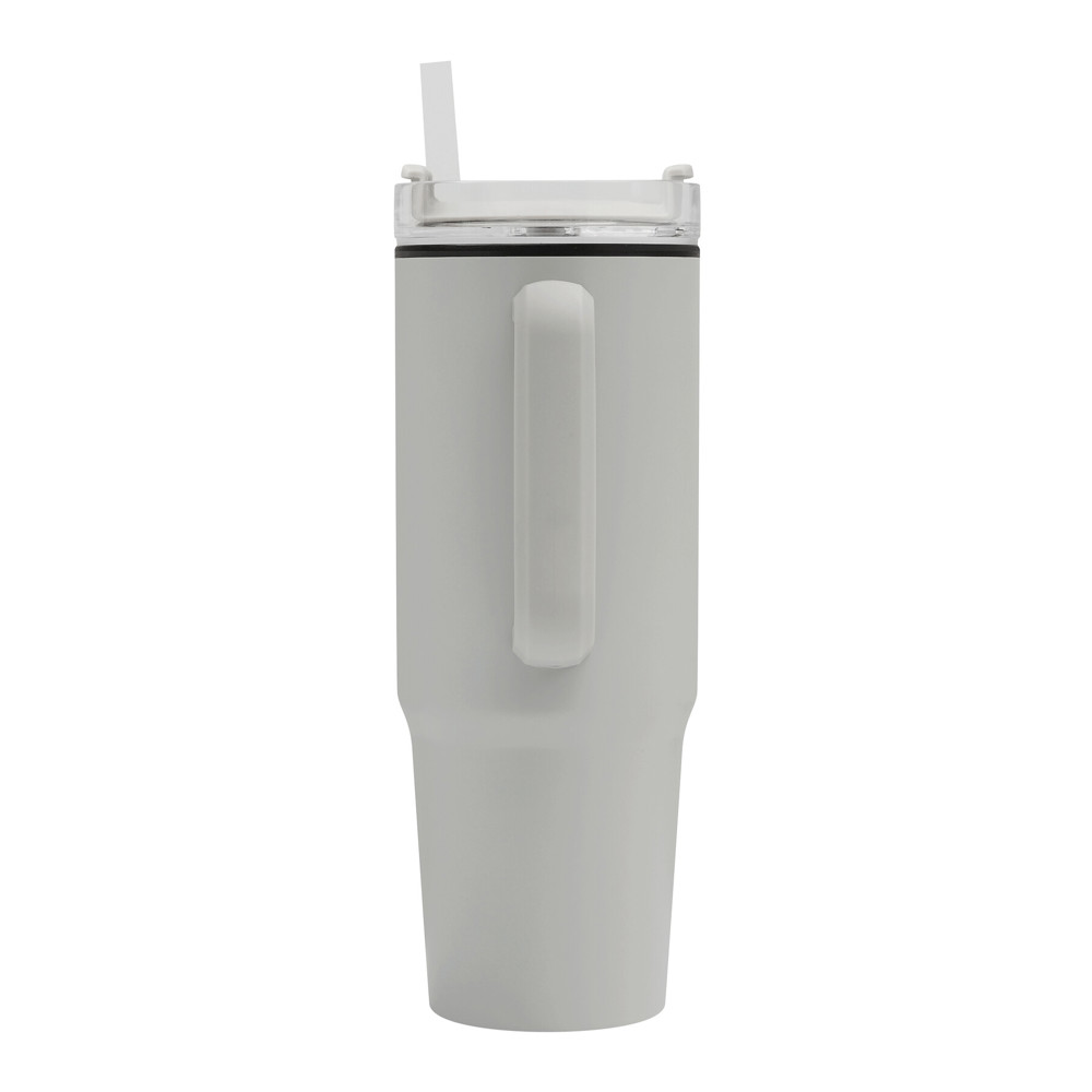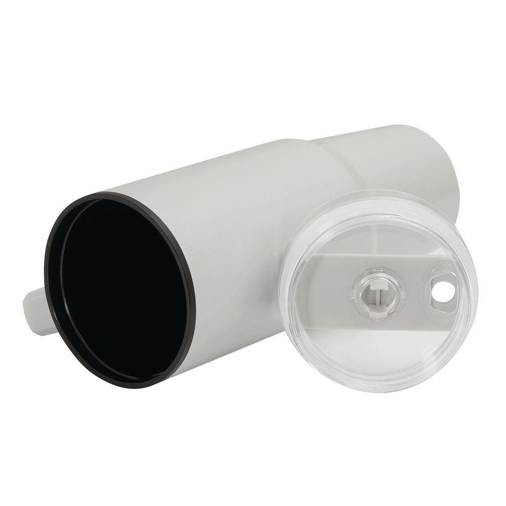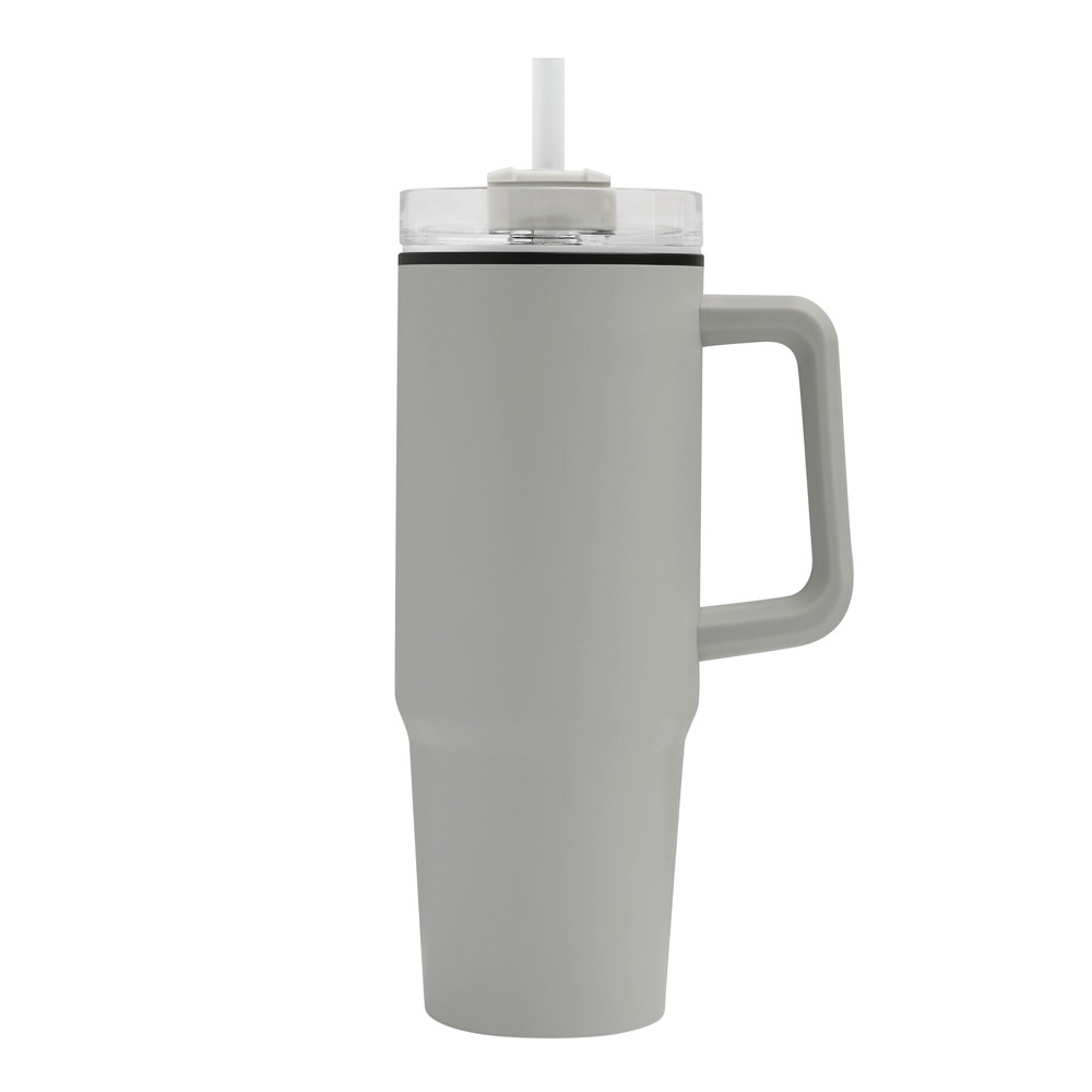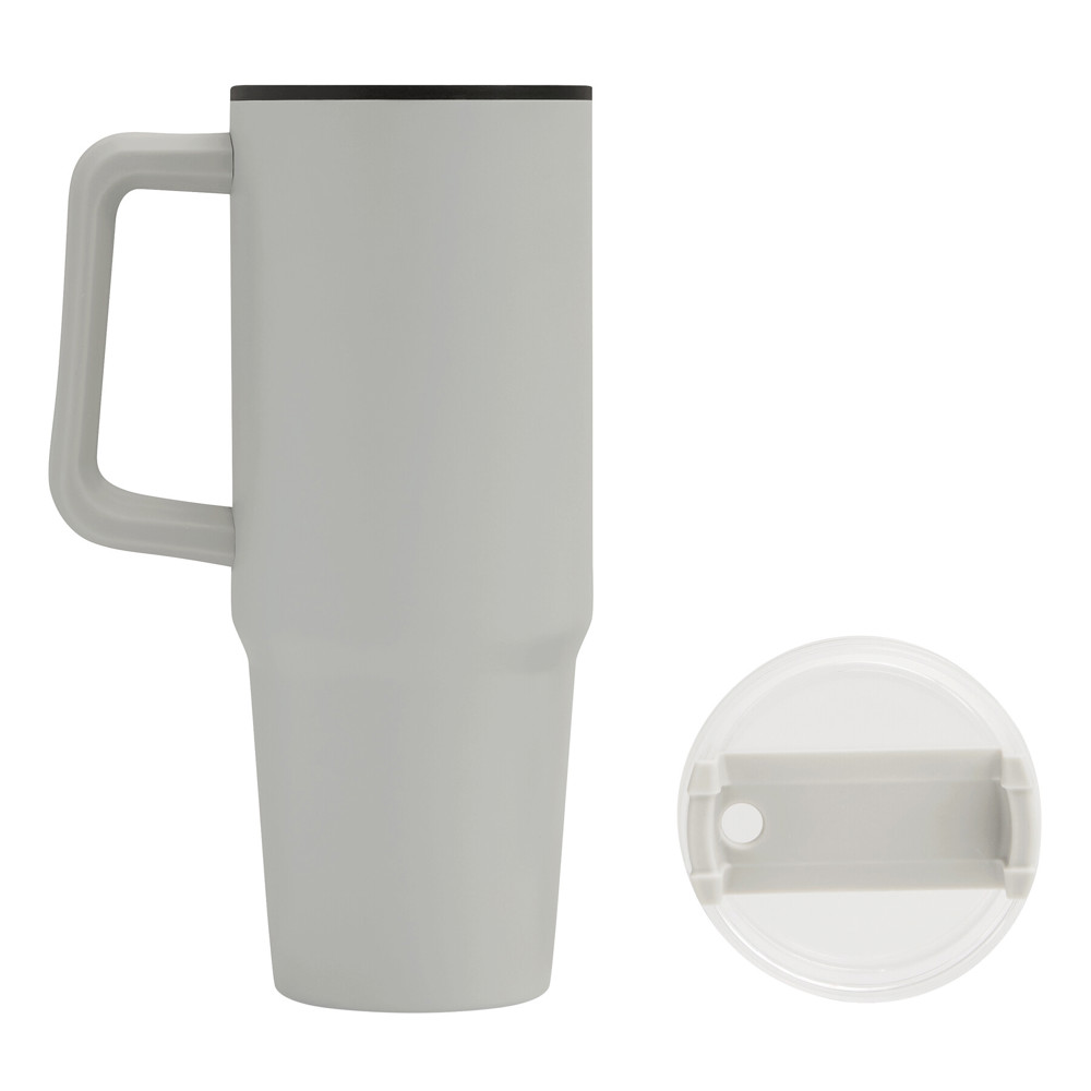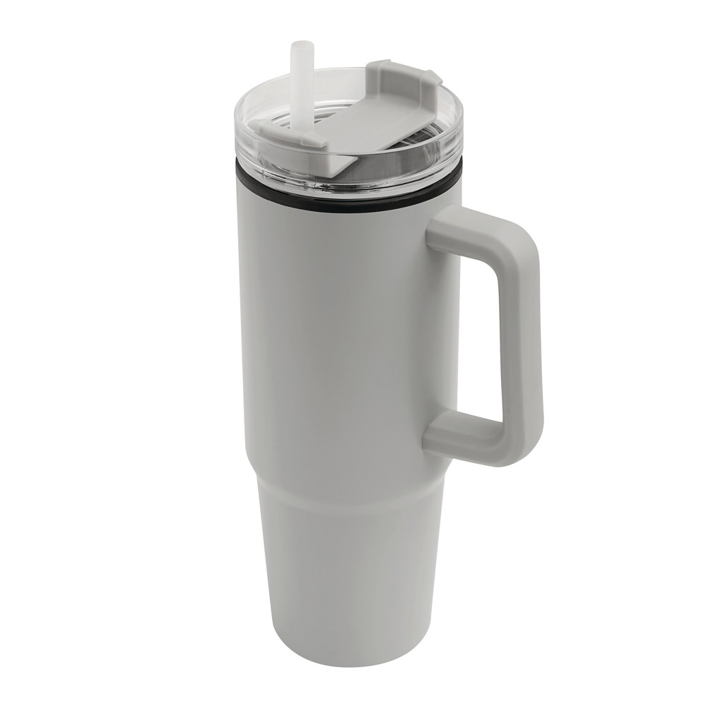 Trinkbecher DRINK ULTY, doppelwandig: innen aus Kunststoff und außen aus Edelstahl, mit praktischem Griff, transparenter Kunststoff-Deckel mit sicherem Schraubverschluss, Silikon-Dichtring, Trinköffnung mit Drehverschluss und transparentem Strohhalm, beschichteter Boden für gute Oberflächenhaftung, Füllmenge ca. 900 ml, hält ca. 2 Stunden warm und bis zu 4 Stunden kalt, in Box