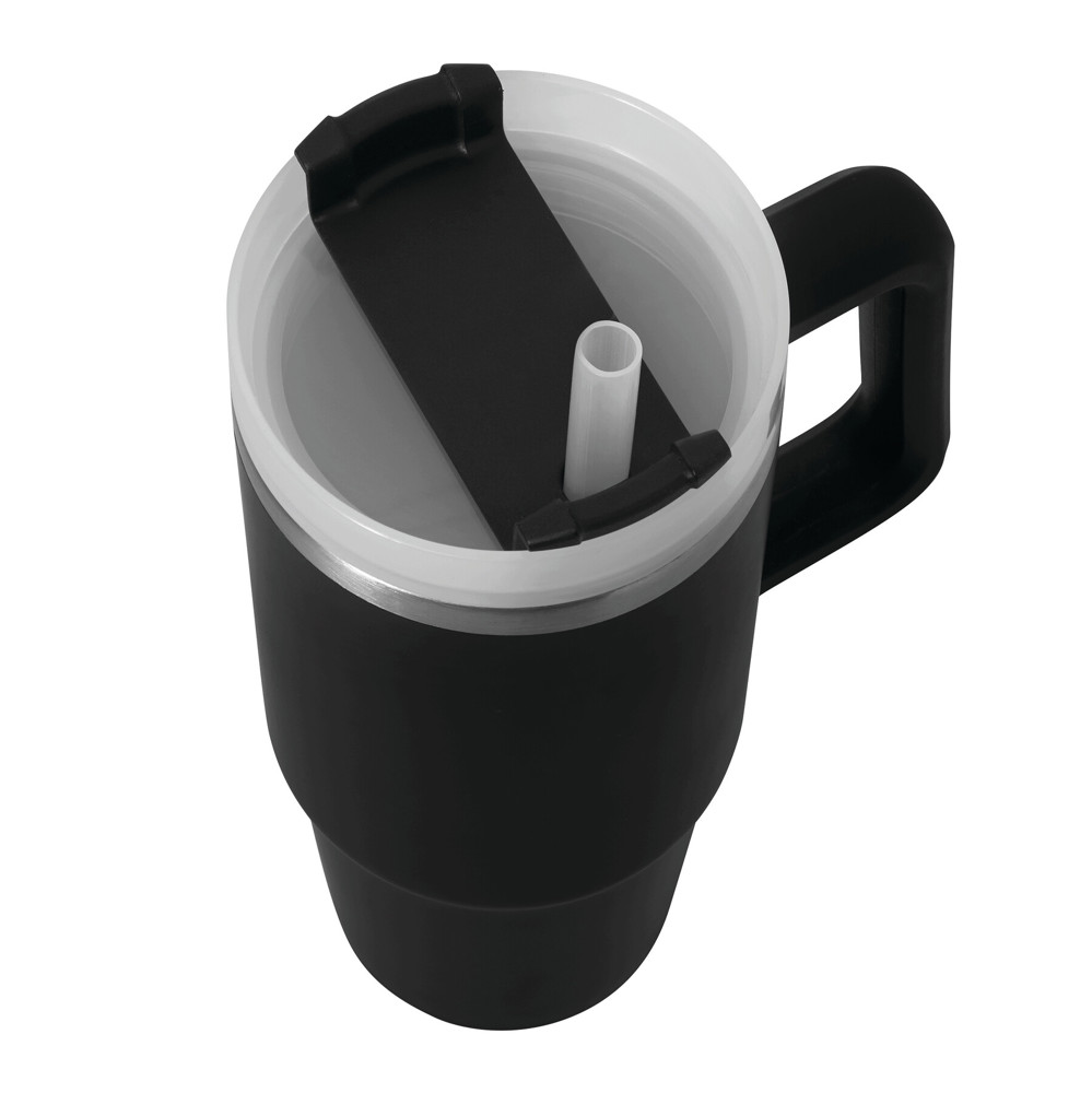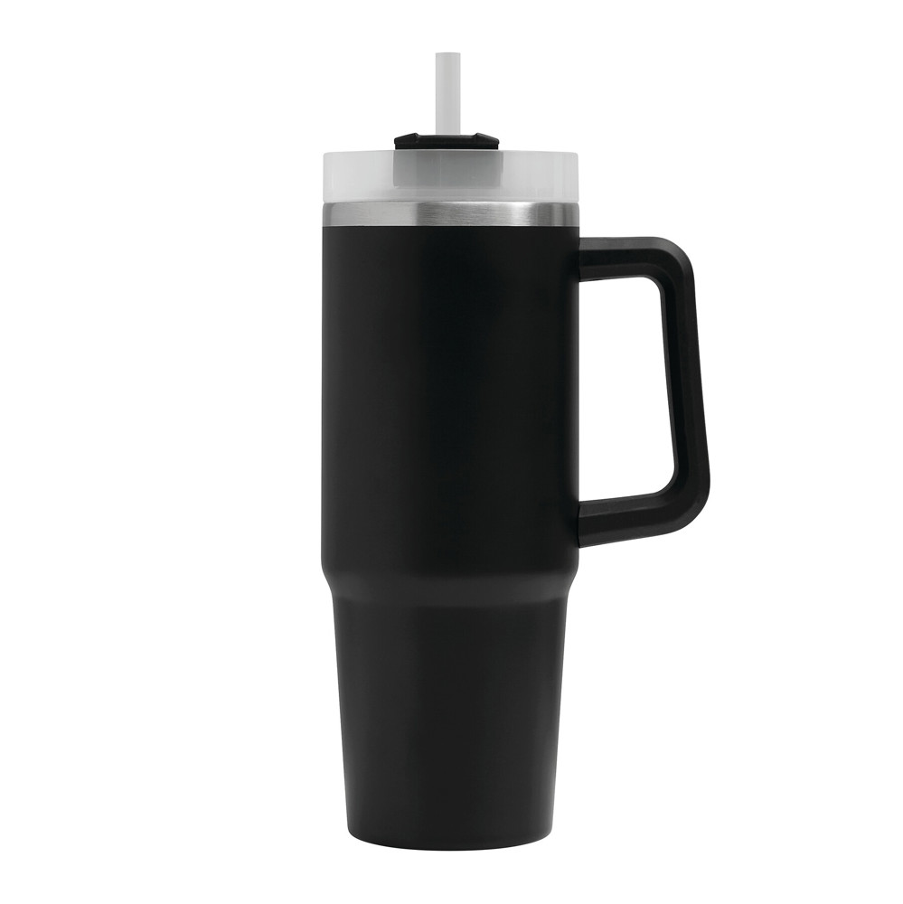 Vakuum-Isolierbecher DRINK DELUXE, doppelwandig: innen und außen aus Edelstahl, mit praktischem Griff, milchig-transparenter Kunststoff-Deckel mit sicherem Schraubverschluss, Silikon-Dichtring, Trinköffnung mit Drehverschluss und transparentem Strohhalm, beschichteter Boden für gute Oberflächenhaftung, Füllmenge ca. 900 ml, hält ca. 5 Stunden warm und bis zu 10 Stunden kalt, in Box
