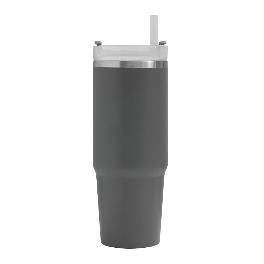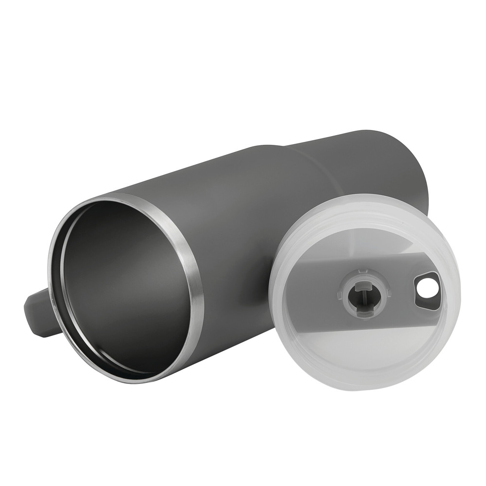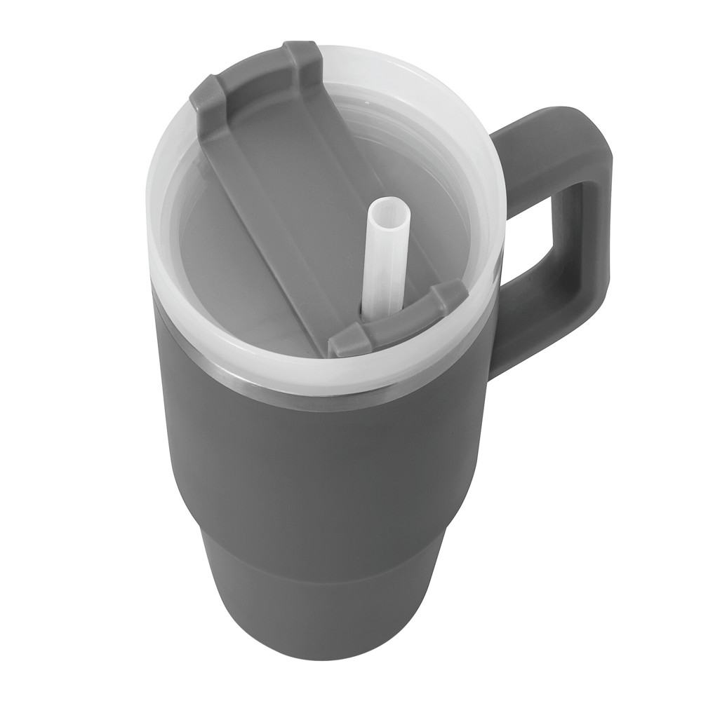 Vakuum-Isolierbecher DRINK DELUXE, doppelwandig: innen und außen aus Edelstahl, mit praktischem Griff, milchig-transparenter Kunststoff-Deckel mit sicherem Schraubverschluss, Silikon-Dichtring, Trinköffnung mit Drehverschluss und transparentem Strohhalm, beschichteter Boden für gute Oberflächenhaftung, Füllmenge ca. 900 ml, hält ca. 5 Stunden warm und bis zu 10 Stunden kalt, in Box
