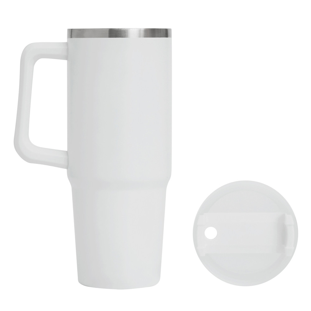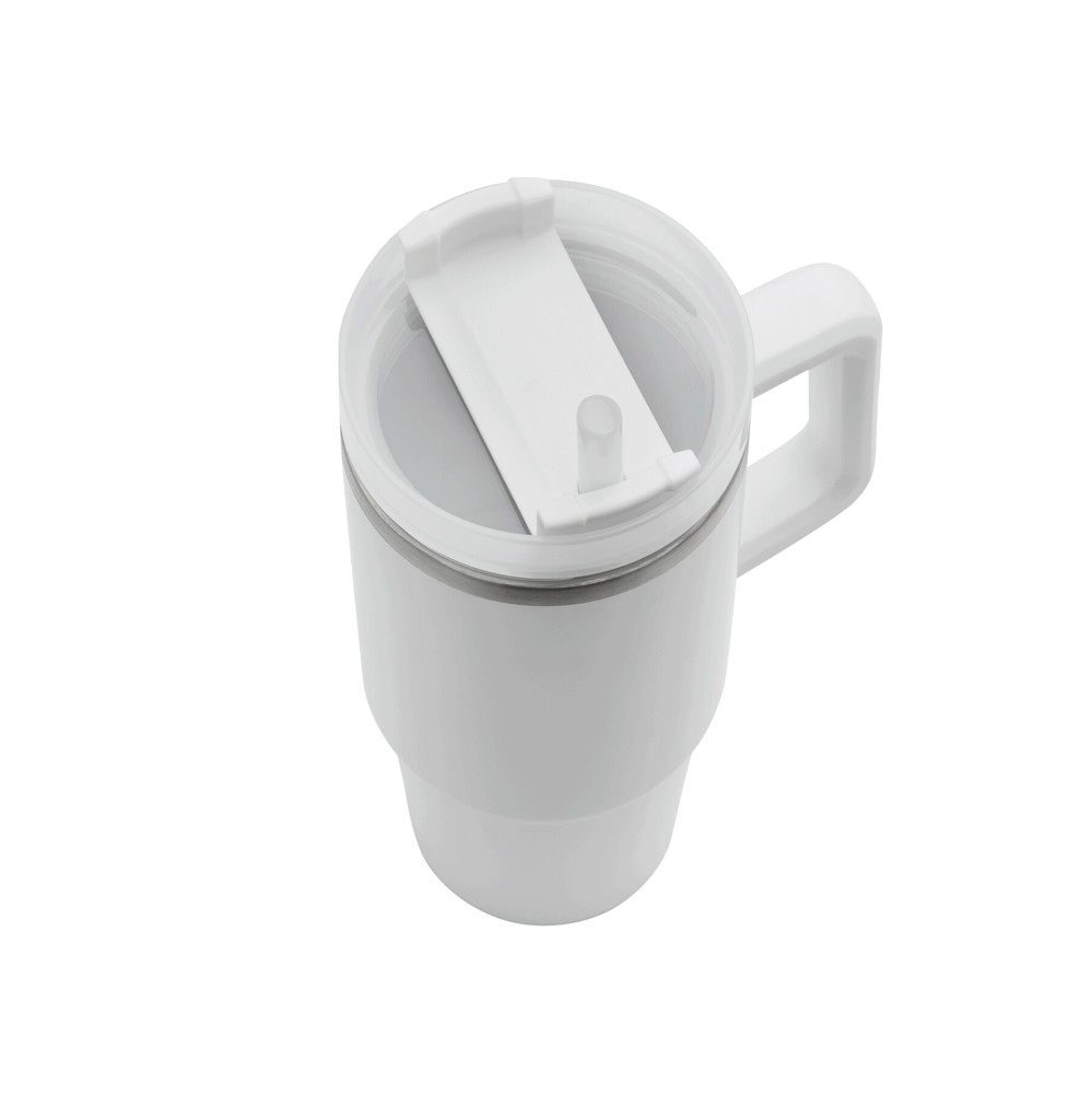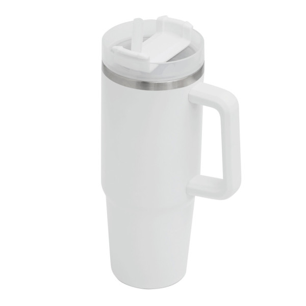Vakuum-Isolierbecher DRINK DELUXE, doppelwandig: innen und außen aus Edelstahl, mit praktischem Griff, milchig-transparenter Kunststoff-Deckel mit sicherem Schraubverschluss, Silikon-Dichtring, Trinköffnung mit Drehverschluss und transparentem Strohhalm, beschichteter Boden für gute Oberflächenhaftung, Füllmenge ca. 900 ml, hält ca. 5 Stunden warm und bis zu 10 Stunden kalt, in Box