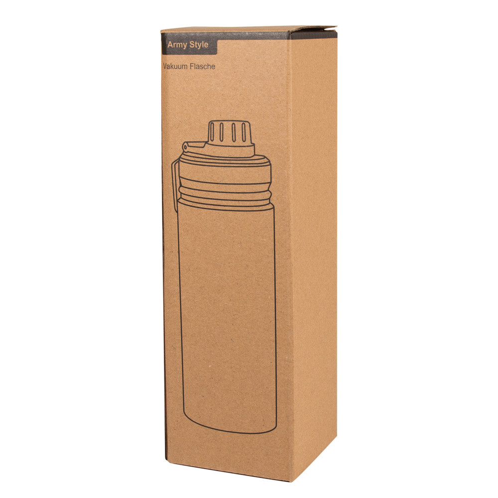 Vakuum-Isolierflasche ARMY STYLE, doppelwandig: außen und innen aus Edelstahl, Pulverlackierung, schwarzer Kunststoff-Deckel mit sicherem Schraubverschluss, Silikon-Dichtring und integrierter verschraubbarer Trinköffnung, Tragegriff, Füllmenge: ca. 600 ml, hält ca. 8 Stunden warm und bis zu 12 Stunden kalt, in Box