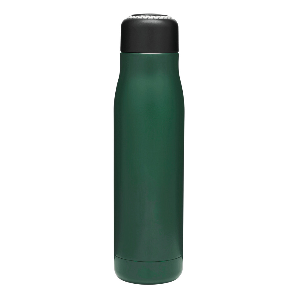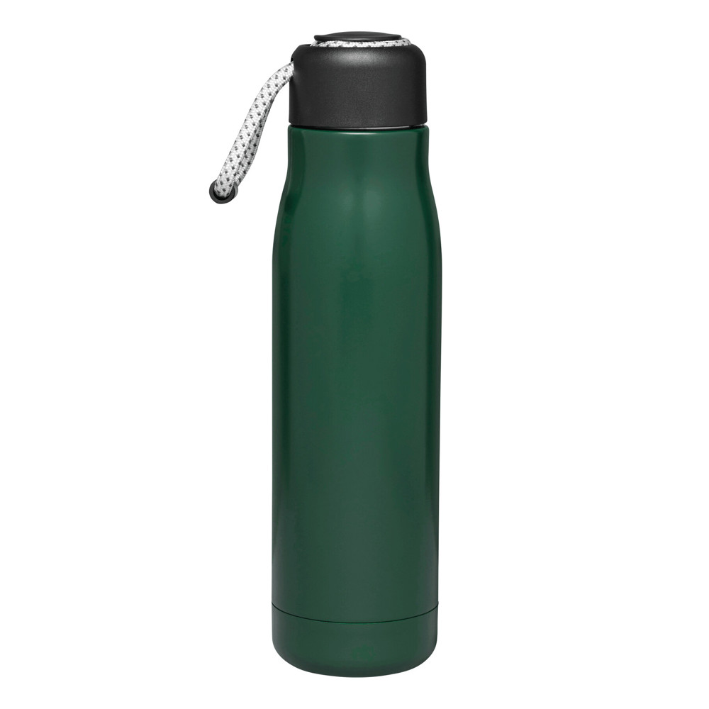 Vakuum-Isolierflasche ROBUSTA, doppelwandig: außen und innen aus Edelstahl, schwarzer Deckel mit sicherem Schraubverschluss und dekorativer Trageschlaufe, Füllmenge: ca. 500 ml, hält ca. 8 Stunden warm und bis zu 12 Stunden kalt
