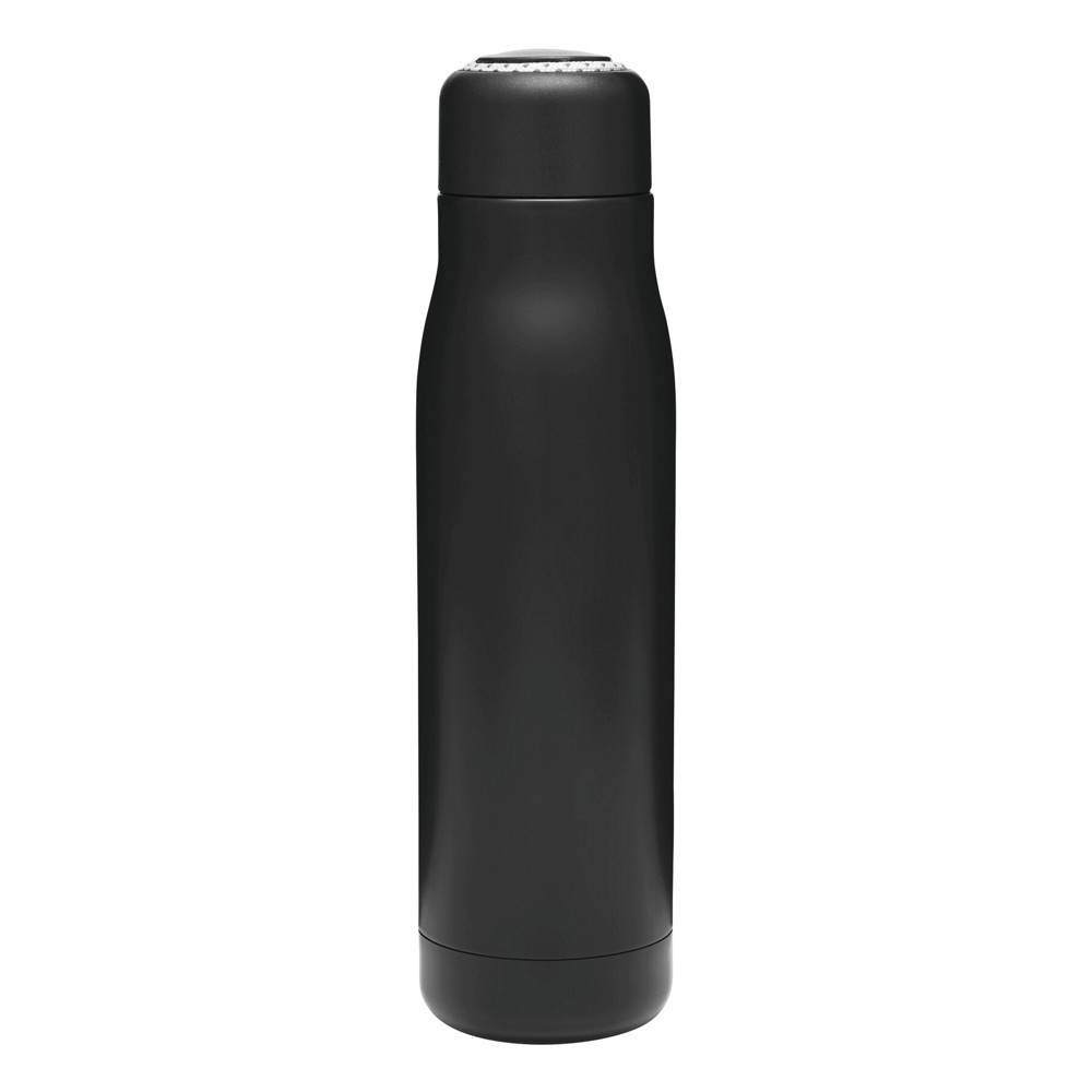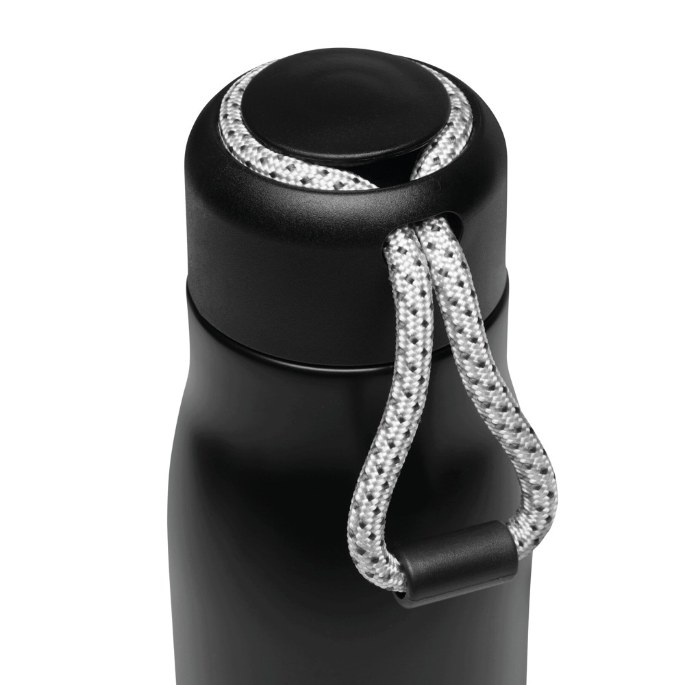Vakuum-Isolierflasche ROBUSTA, doppelwandig: außen und innen aus Edelstahl, schwarzer Deckel mit sicherem Schraubverschluss und dekorativer Trageschlaufe, Füllmenge: ca. 500 ml, hält ca. 8 Stunden warm und bis zu 12 Stunden kalt