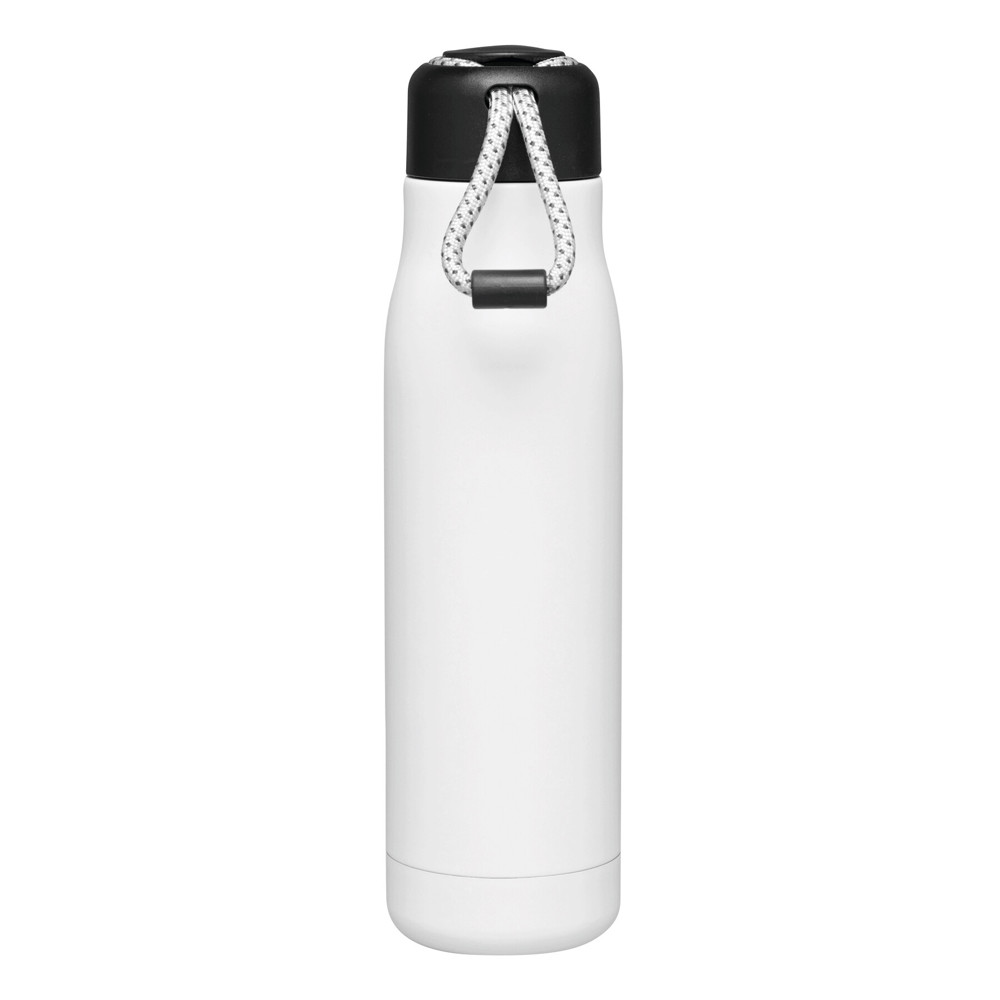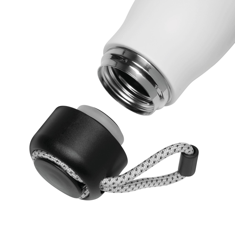 Vakuum-Isolierflasche ROBUSTA, doppelwandig: außen und innen aus Edelstahl, schwarzer Deckel mit sicherem Schraubverschluss und dekorativer Trageschlaufe, Füllmenge: ca. 500 ml, hält ca. 8 Stunden warm und bis zu 12 Stunden kalt