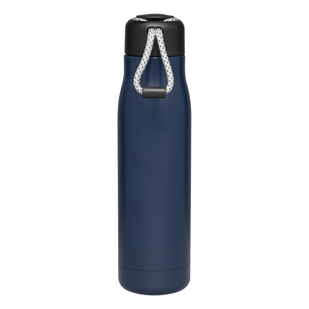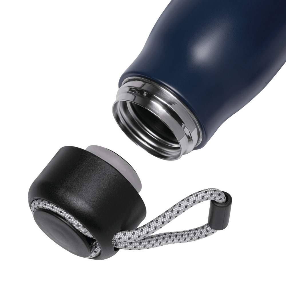 Vakuum-Isolierflasche ROBUSTA, doppelwandig: außen und innen aus Edelstahl, schwarzer Deckel mit sicherem Schraubverschluss und dekorativer Trageschlaufe, Füllmenge: ca. 500 ml, hält ca. 8 Stunden warm und bis zu 12 Stunden kalt