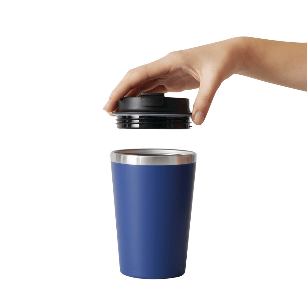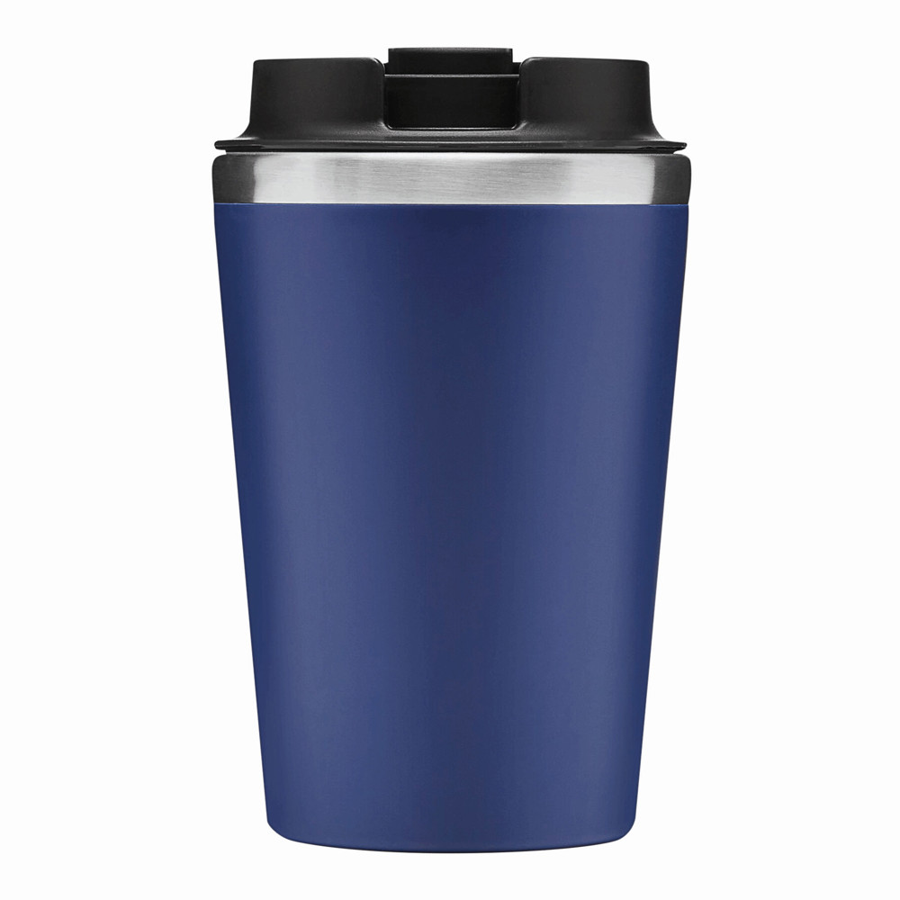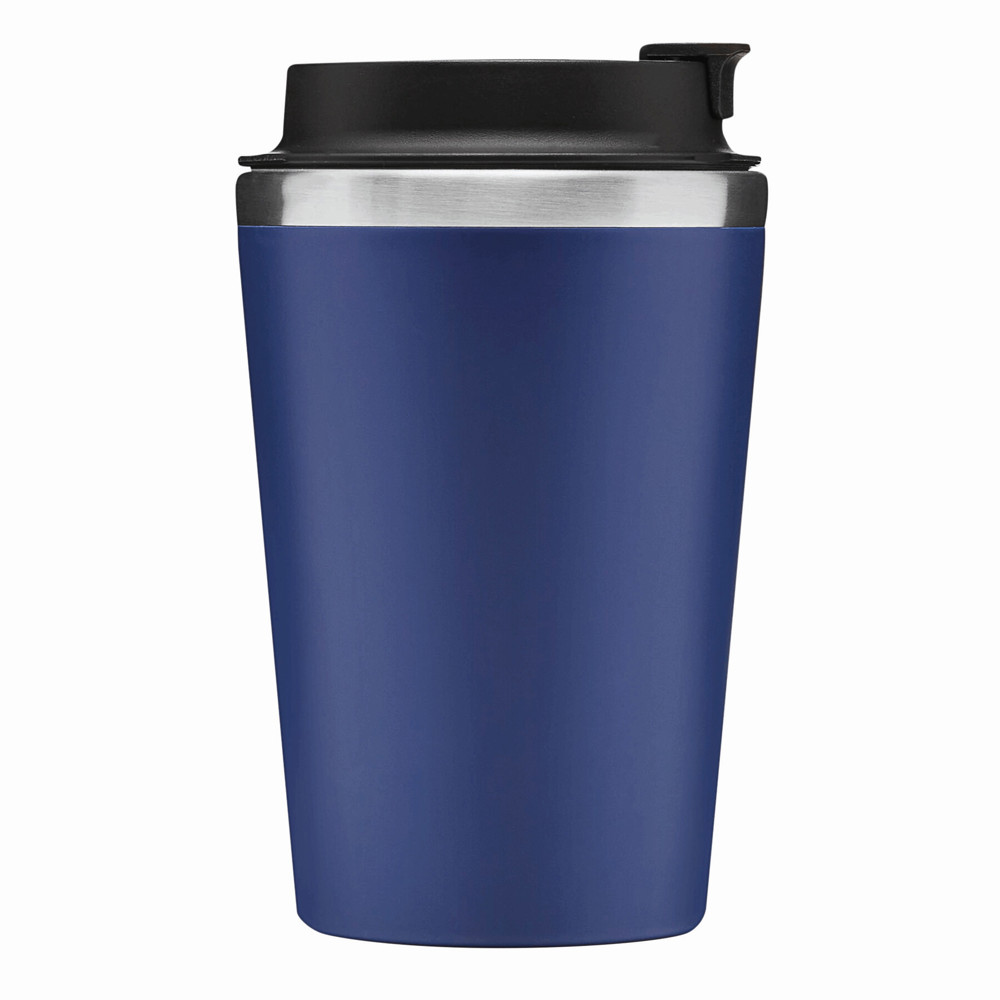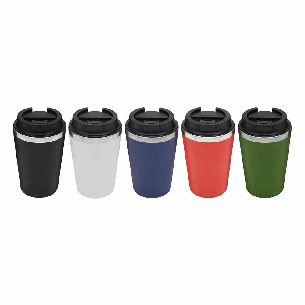 Trinkbecher TAKE & GO, doppelwandig: innen aus Edelstahl und außen aus Kunststoff, schwarzer Kunststoff-Deckel mit sicherem Schraubverschluss, Silikon-Dichtring und integrierter Trinköffnung zum Aufklappen, beschichteter Boden für gute Oberflächenhaftung, Füllmenge ca. 350 ml, hält ca. 2 Stunden warm und bis zu 4 Stunden kalt