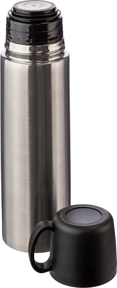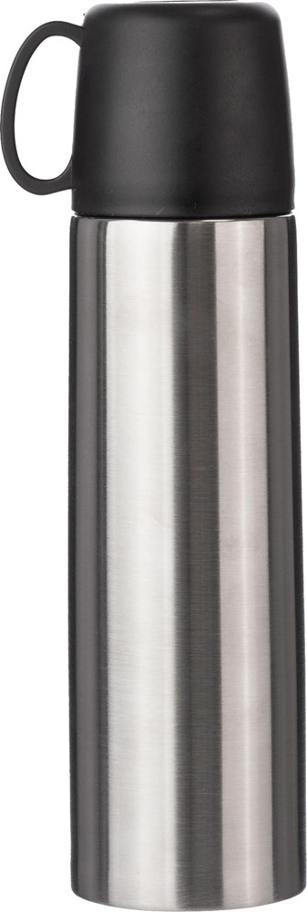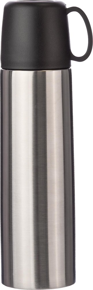Doppelwandige Isolierflasche aus Edelstahl (s/s304) (500 ml) mit Becher/Deckel aus PP. Das Fassungsvermögen des Bechers beträgt 130 ml. Verpackt pro Stück in einer braunen Kartonverpackung.