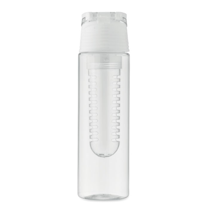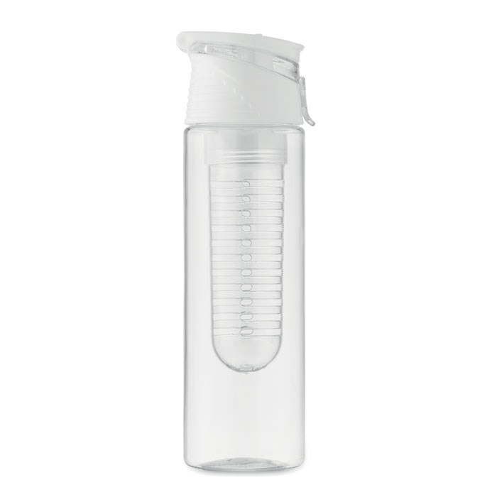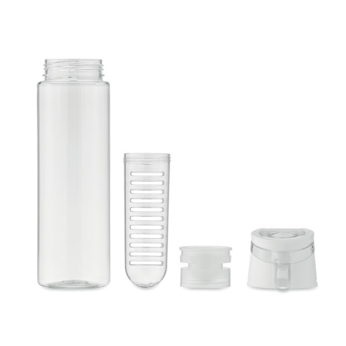 Trinkflasche aus RPET mit entnehmbarem Frucht-Aromafach. Henkel und auslaufsicherer Deckel. Füllmenge: 500 ml.