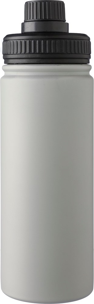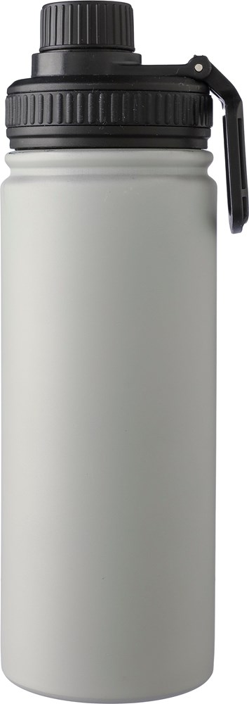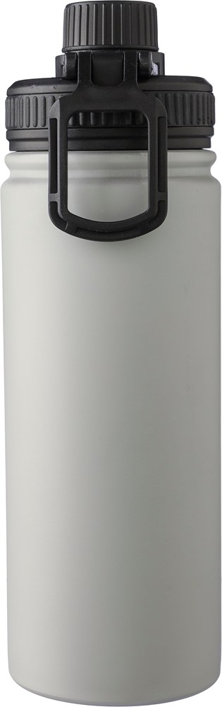Doppelwandige Edelstahl-Trinkflasche (500 ml) mit PP-Deckel, PP-Schraubverschluss und Tragegriff. Das Innere der Flasche besteht aus Edelstahl 304, das Äußere aus Edelstahl 201. Einzeln verpackt in braunem Karton.