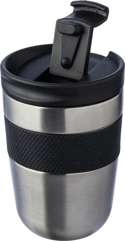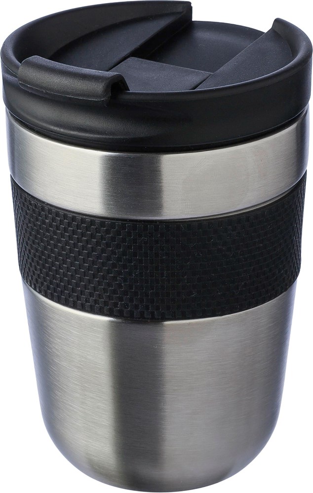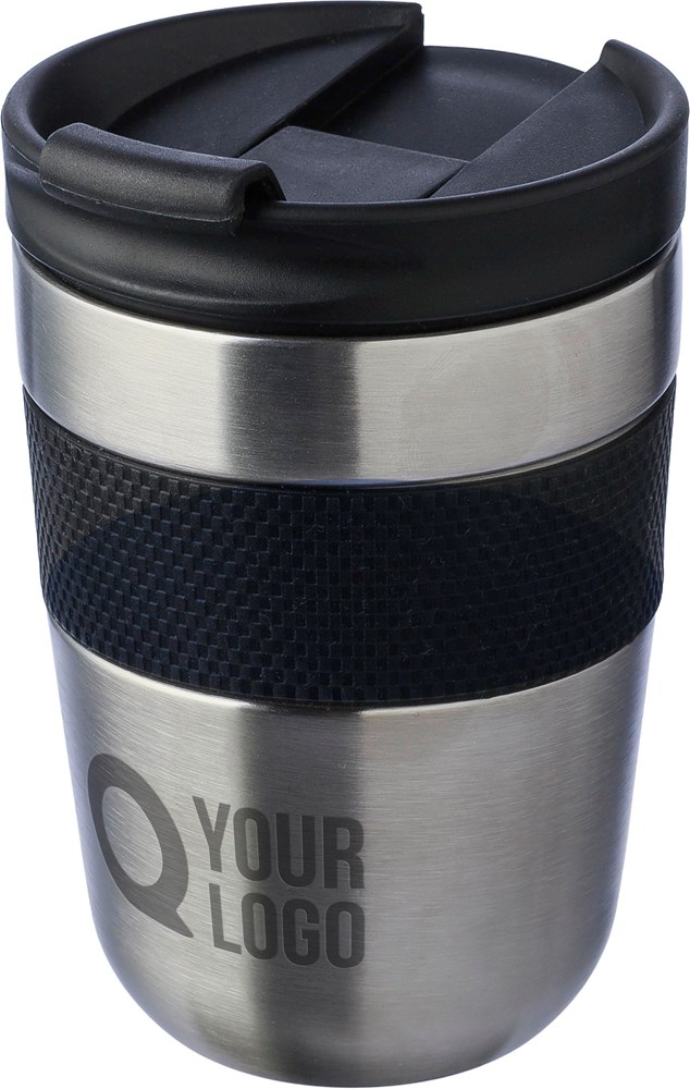 Doppelwandiger Trinkbecher aus Edelstahl (300 ml) mit PP-Deckel und Silikongriff. Hält den Inhalt 4 Stunden heiß und 6 Stunden kalt. Innen aus Edelstahl 304, außen aus Edelstahl 201. Einzeln verpackt in braunem Karton.