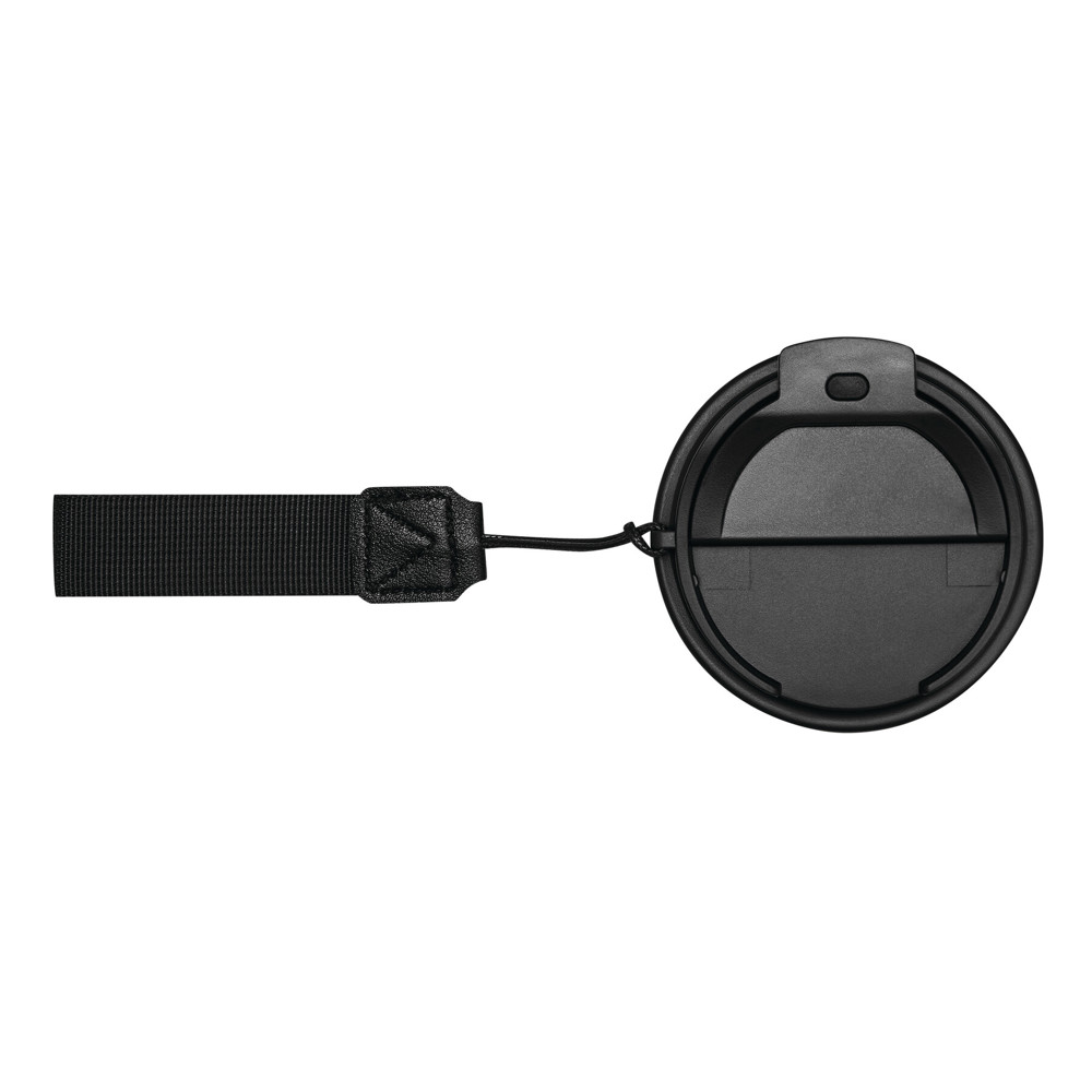 Vakuum-Trinkbecher TRAVEL MUG, doppelwandig: innen und außen aus Edelstahl, matte Pulverlackierung, schwarzer Kunststoff-Deckel mit sicherem Schraubverschluss, Silikon-Dichtring, integrierter Trinköffnung zum Aufklappen und Trageschlaufe aus recyceltem Kunststoff, Füllmenge ca. 400 ml, hält ca. 8 Stunden warm und bis zu 12 Stunden kalt, in Box