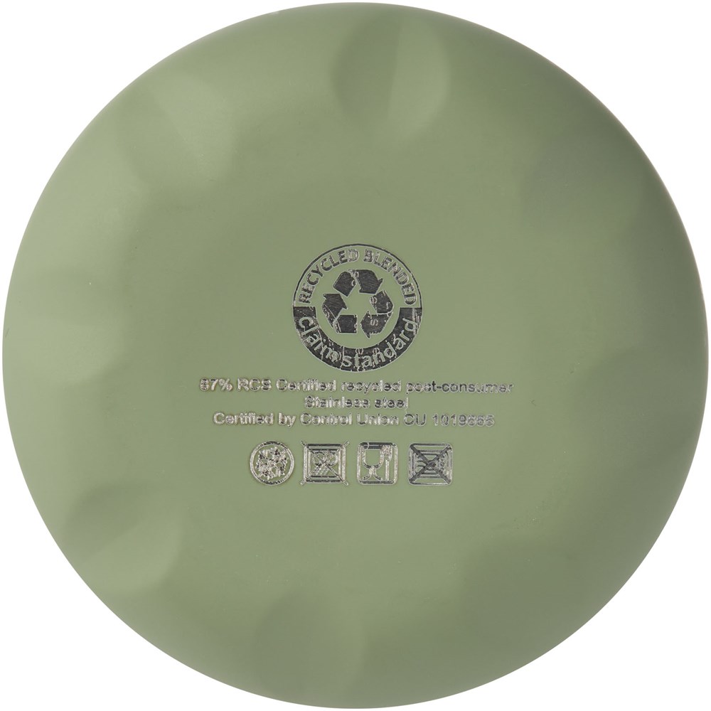 Vakuumisolierte, RCS-zertifizierte Flasche aus recyceltem Edelstahl mit kultigem Design. Mit einem Sockel, der in die meisten Getränkehalter passt, ist diese elegante Wasserflasche ein perfekter Werbeartikel. Geprüft und zugelassen nach deutschem Lebensmittelsicherheitsgesetz (LFGB) und gemäß REACH Verordnung auf Phtalate getestet. Das Fassungsvermögen beträgt 500 ml. Verpackt in einer Geschenkbox aus Recyclingkarton. Hält Getränke 12 Stunden heiß und 24 Stunden kalt.