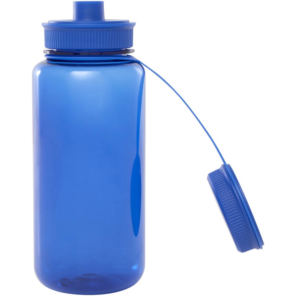 Einwandige Sportflasche aus RCS-zertifiziertem RPET mit Schraubverschluss und auslaufsicherem Deckel mit praktischem Tragegriff im Verschluss. Konstruktion mit zwei Öffnungen für einfache Reinigung und Befüllung. Entspricht dem von der EFSA (Europäische Behörde für Lebensmittelsicherheit) genehmigten PET-Recyclingverfahren. Fassungsvermögen: 900 ml.