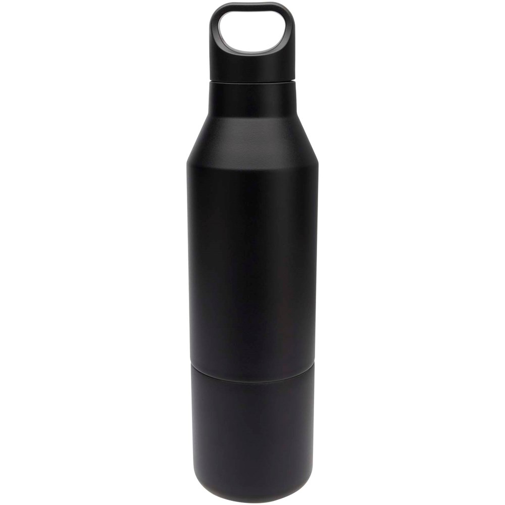 RCS-zertifizierte doppelwandige Kupfer-Isolierflasche aus Edelstahl mit abnehmbarem Becher, ebenso doppelwandig. Diese Mehrzweck-Flasche ist so konzipiert, dass sie in die Seitentasche eines Rucksacks passt, und verfügt über einen praktischen in den Deckel integrierten Tragegriff. Die Außenseite der Flasche ist mit einer langlebigen Pulverbeschichtung versehen. Hält Getränke 12 Stunden warm oder 24 Stunden kalt. Verpackt in einer Geschenkbox aus Recyclingkarton. Fassungsvermögen der Flasche: 600 ml. Fassungsvermögen Tasse: 300 ml.