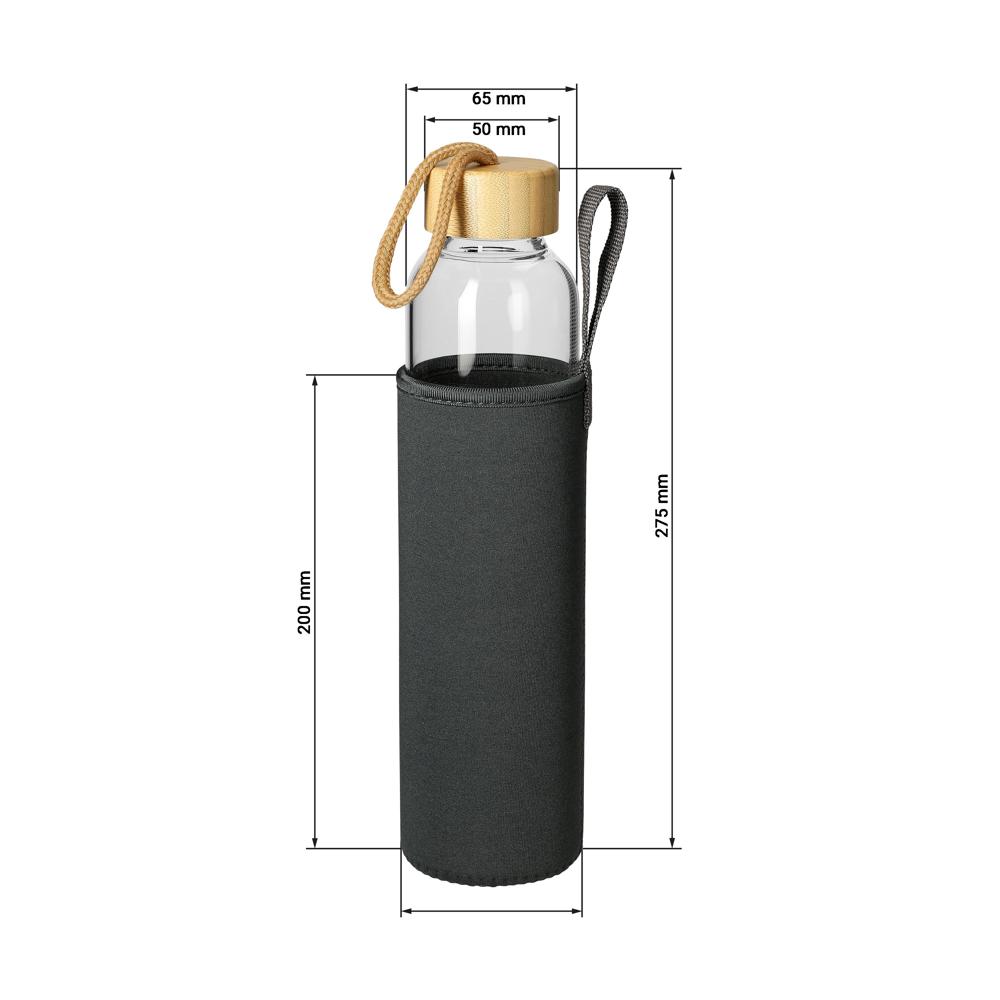 Flasche aus Borosilikat-Glas mit Schraubverschluss aus Bambus-Holz inkl. Silikondichtung. Die griffige, graue Synthesekautschukhülle mit Halteschlaufe hält die Temperatur der Getränke länger konstant. Zudem schützt sie die Hände bei heißen Getränken vor dem warmen Glas. Füllmenge: 0,65 Liter.