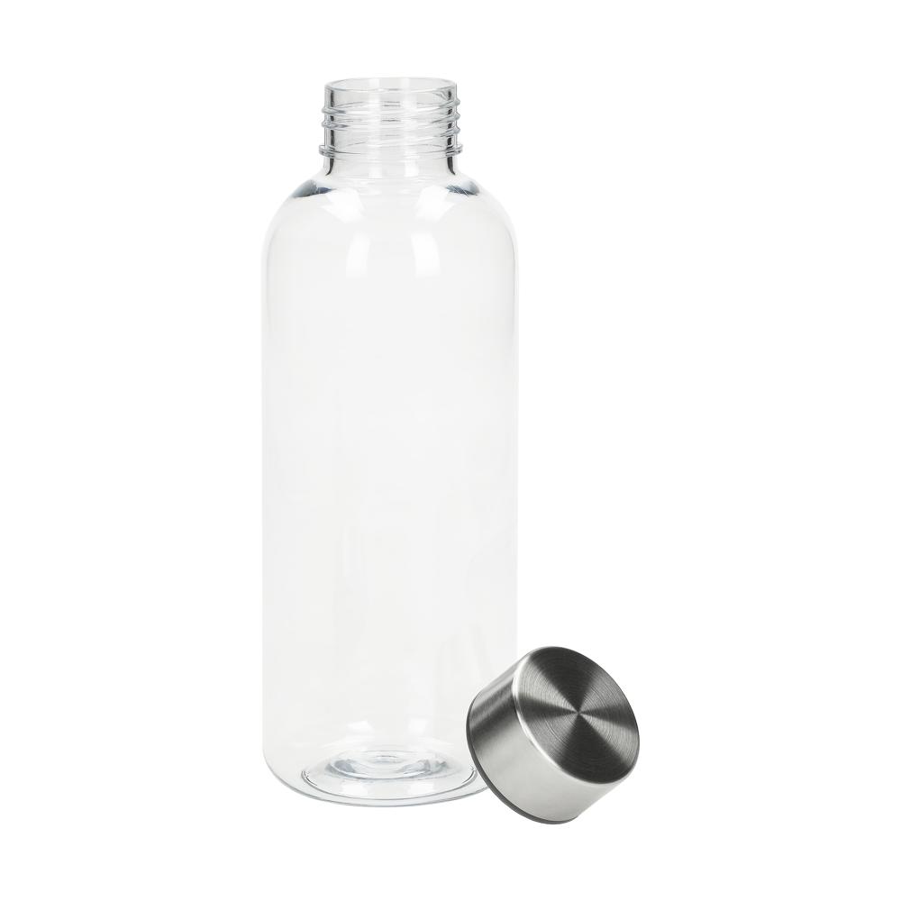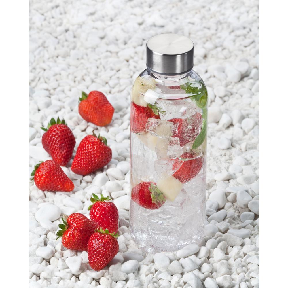Glasklare Flasche aus SAN Kunststoff mit Schraubverschluss aus Edelstahl mit Gummieinlage für eine hohe Dichtigkeit. Füllmenge: 0,6 Liter.