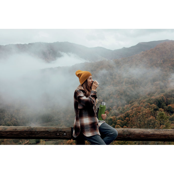 Doppelwandige Isolierflasche mit Becher aus recyceltem Edelstahl (90% recycelter Edelstahl und 10% Edelstahl) mit seitlichem Henkel. Verschluss aus PP. Auslaufsicher. Füllmenge: 1L.