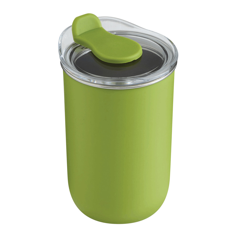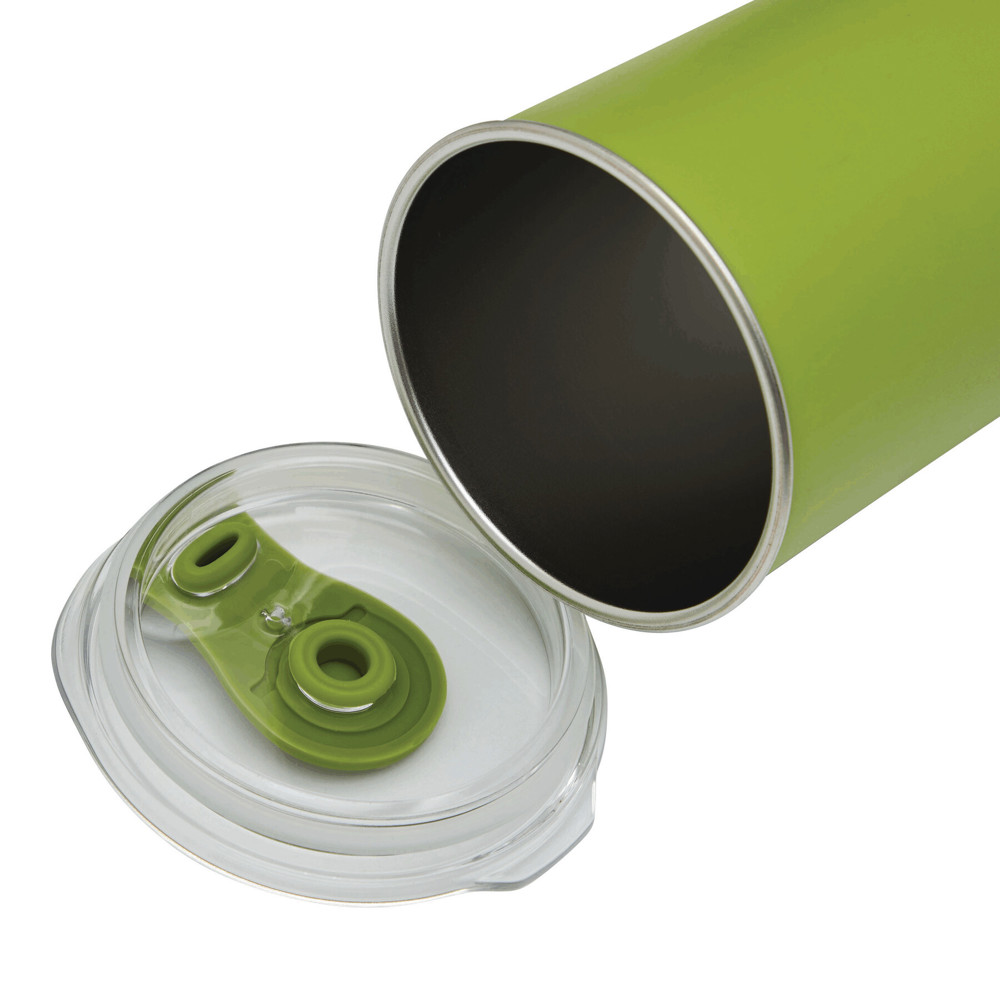 Trinkbecher SIP, doppelwandig: innen aus Edelstahl und außen aus Kunststoff, transparenter Kunststoff-Deckel mit Silikon-Dichtring und integrierter Trinköffnung (mit Silikon-Abdeckung), Füllmenge ca. 350 ml, hält ca. 2 Stunden warm und bis zu 4 Stunden kalt, nicht geeignet für Heißgetränke, in Box