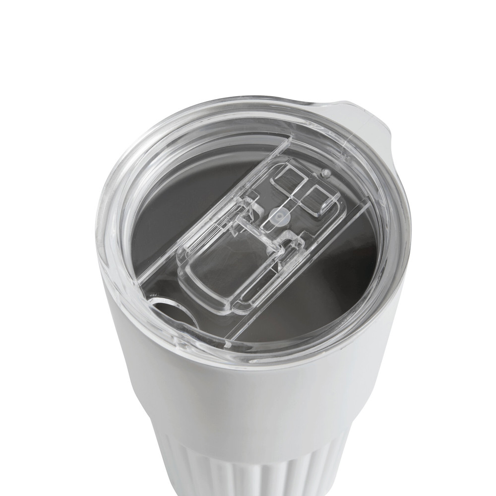 Vakuum-Isolierbecher WAVE LINE, doppelwandig: innen aus recyceltem Edelstahl und außen aus Edelstahl, transparenter Kunststoff-Deckel mit Silikon-Dichtring und integrierter Trinköffnung zum Aufschieben, beschichteter Boden für gute Oberflächenhaftung, Füllmenge ca. 600 ml, hält ca. 4 Stunden warm und bis zu 8 Stunden kalt, in Box