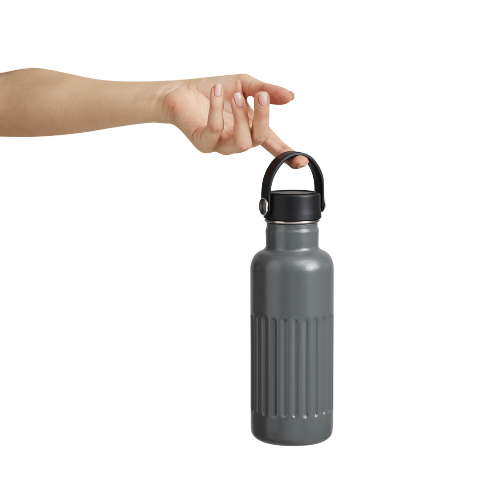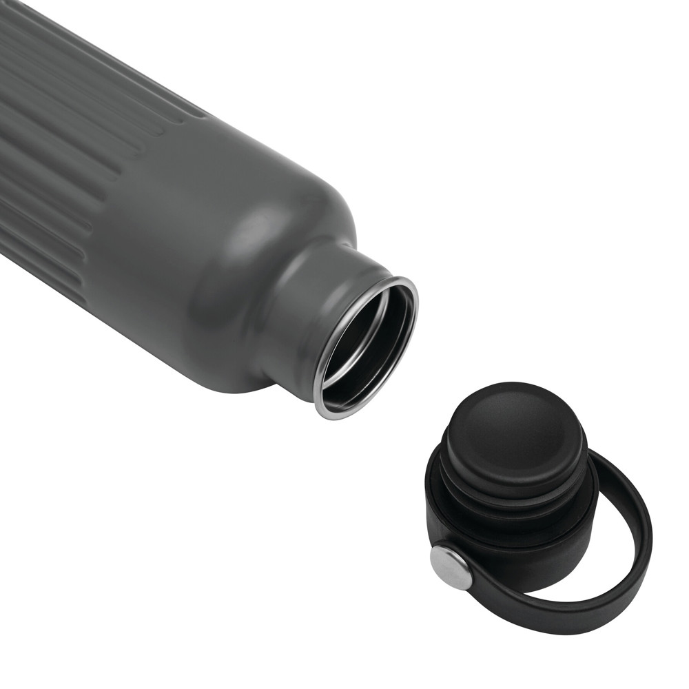 Vakuum-Isolierflasche WAVE TRAIL, doppelwandig: innen aus recyceltem Edelstahl und außen aus Edelstahl, schwarzer Kunststoff-Deckel mit sicherem Schraubverschluss, Silikon-Dichtring und Kunststoff-Trageschlaufe, Füllmenge ca. 500 ml, hält ca. 8 Stunden warm und bis zu 12 Stunden kalt, in Box