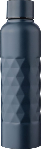 Es handelt sich um eine einwandige Trinkflasche aus recyceltem Edelstahl (800 ml) mit rautenförmiger Textur auf dem Körper, Schraubdeckel und einem lasergravierten Recycling-Logo. Sie wurde aus Edelstahl 304 hergestellt. Sie ist einzeln verpackt in einer braunen Pappschachtel.