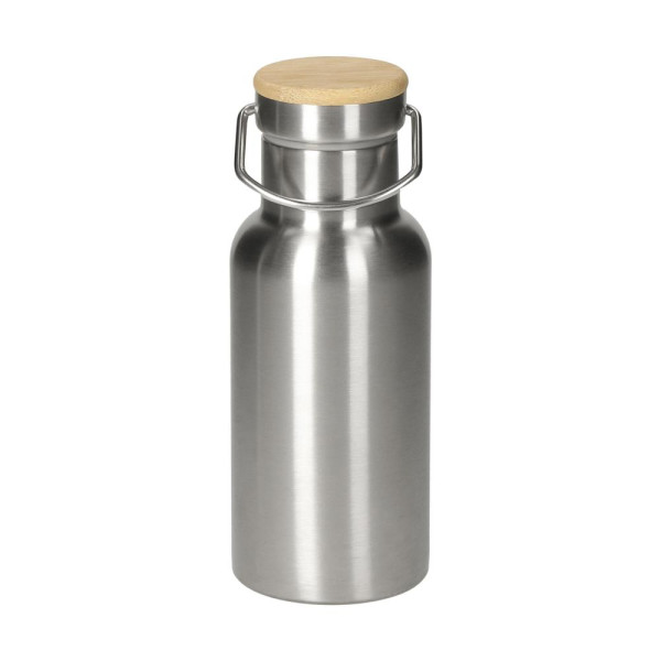 Kleine Isolierflasche im minimalistischen Design - Perfekt für Arbeit, Yoga, Wandern, Reisen und sämtliche alltäglichen Aktivitäten. Leichte, doppelwandige Flasche aus Edelstahl mit einem Schraubdeckel. Dieser verfügt über eine Silikondichtung, einen Tragegriff für den leichteren Tansport und einer Deckelkappe aus unlackiertem Bambus-Holz. Füllmenge: 0,35 Liter.