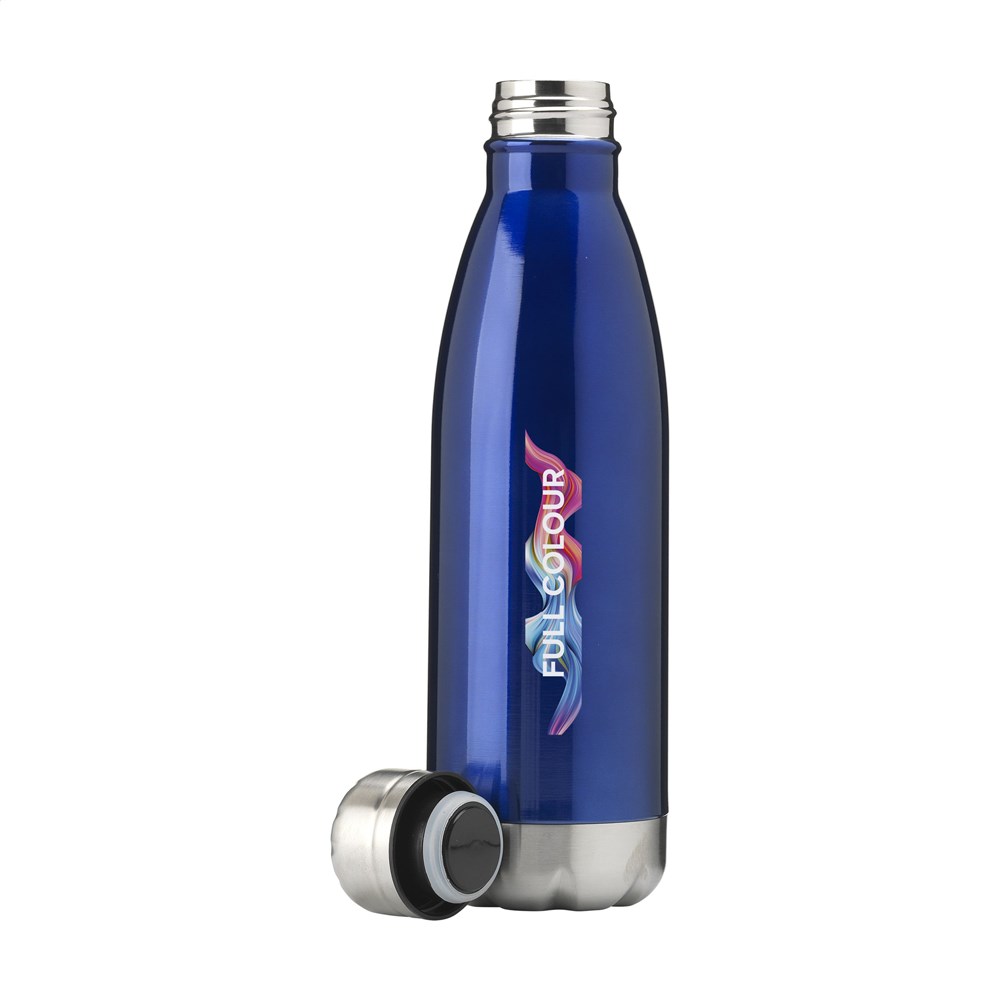 Doppelwandige, vakuumisolierte, rostfreie Wasserflasche/Thermoflasche. Mit tropfsicherem Schraubdeckel. Hergestellt in Metallic oder mit schöner, matter Beschichtung (nur schwarz und weiß). Geeignet zur Temperaturerhaltung von kaltem oder heißem Wasser. Nicht spülmaschinengeeignet. Fassungsvermögen 500 ml. Verpackt pro Stück.