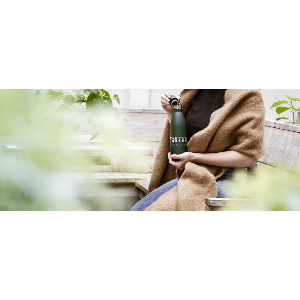 Doppelwandige, auslaufsichere Wasser-/Thermosflasche aus recyceltem Edelstahl. Das trendige, matte Finish verleiht dieser Flasche ein markantes Erscheinungsbild. Mit Schraubdeckel in derselben Farbe. Diese schlanke Flasche passt in den Getränkehalter fast aller Autos und ist ein perfekter Durstlöscher für unterwegs. Nicht spülmaschinengeeignet. RCS-zertifiziert. Gesamtes recyceltes Material: 85%. Fassungsvermögen 500 ml. Edelstahl kann viele Male recycelt werden – die Qualität des Materials bleibt dabei weitgehend erhalten. Durch die Verwendung von recyceltem Edelstahl kommt eine geringere Menge an neuen Rohstoffen zum Einsatz. Das bedeutet weniger Energieverbrauch und weniger Wasserverbrauch. Verpackt pro Stück.
