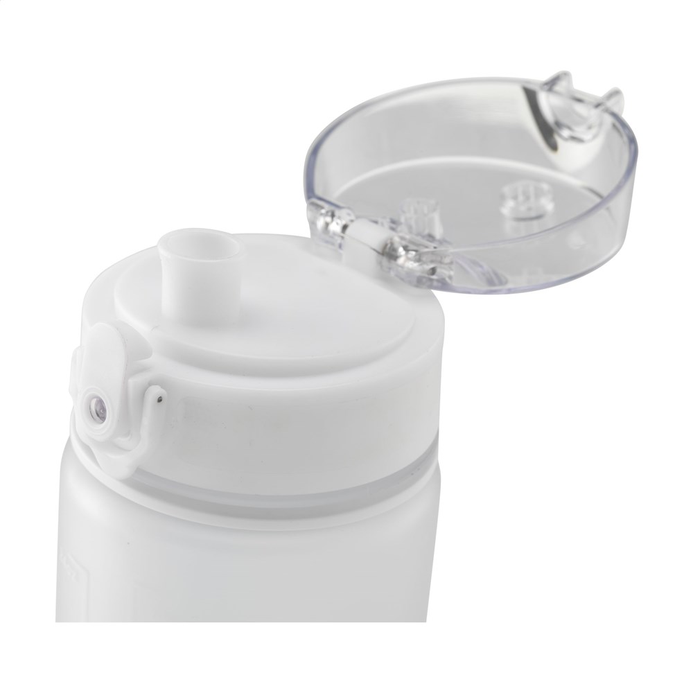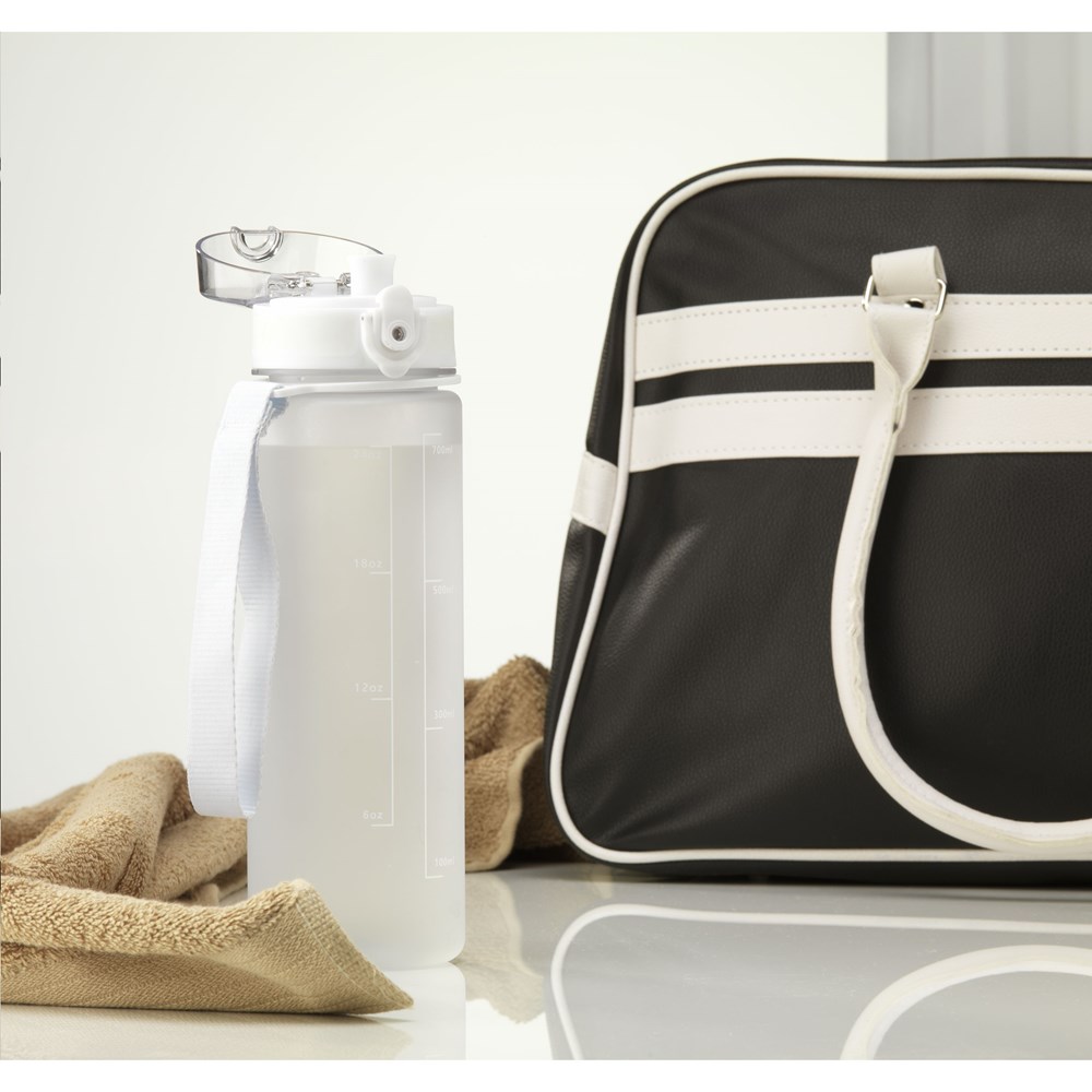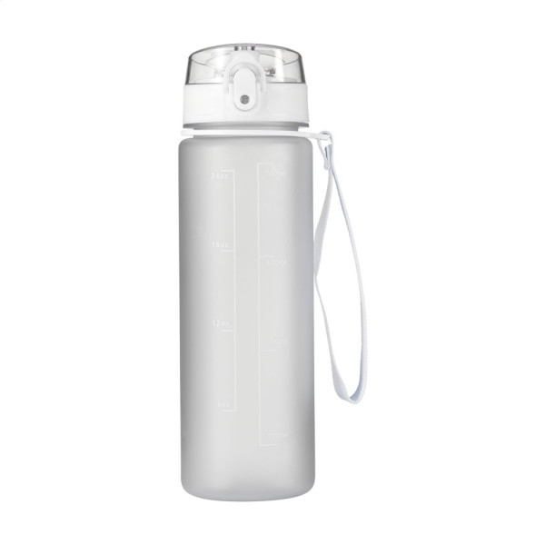 Matt transparente Kunststoff-Wasserflasche mit auslaufsicherem Schraubverschluss und praktischer Trageschlaufe. Der Schraubverschluss hat eine Trinktülle und ist mit einem transparenten Deckel mit Druckknopf und Verschluss hygienisch verschlossen. Mit Inhaltsangabe in ml und oz auf der Außenseite der Flasche. Nicht spülmaschinengeeignet. Fassungsvermögen 750 ml.